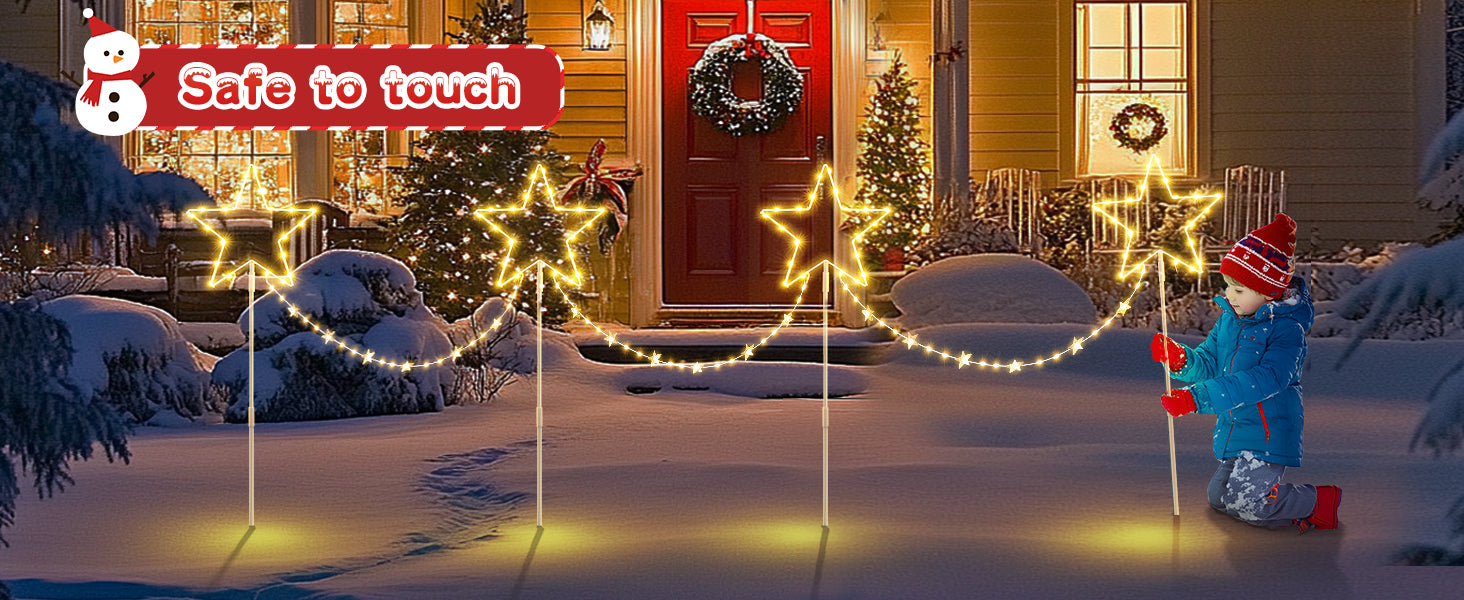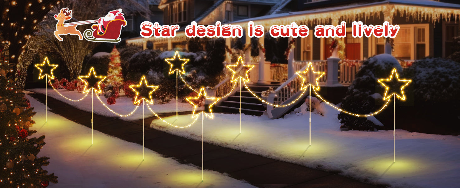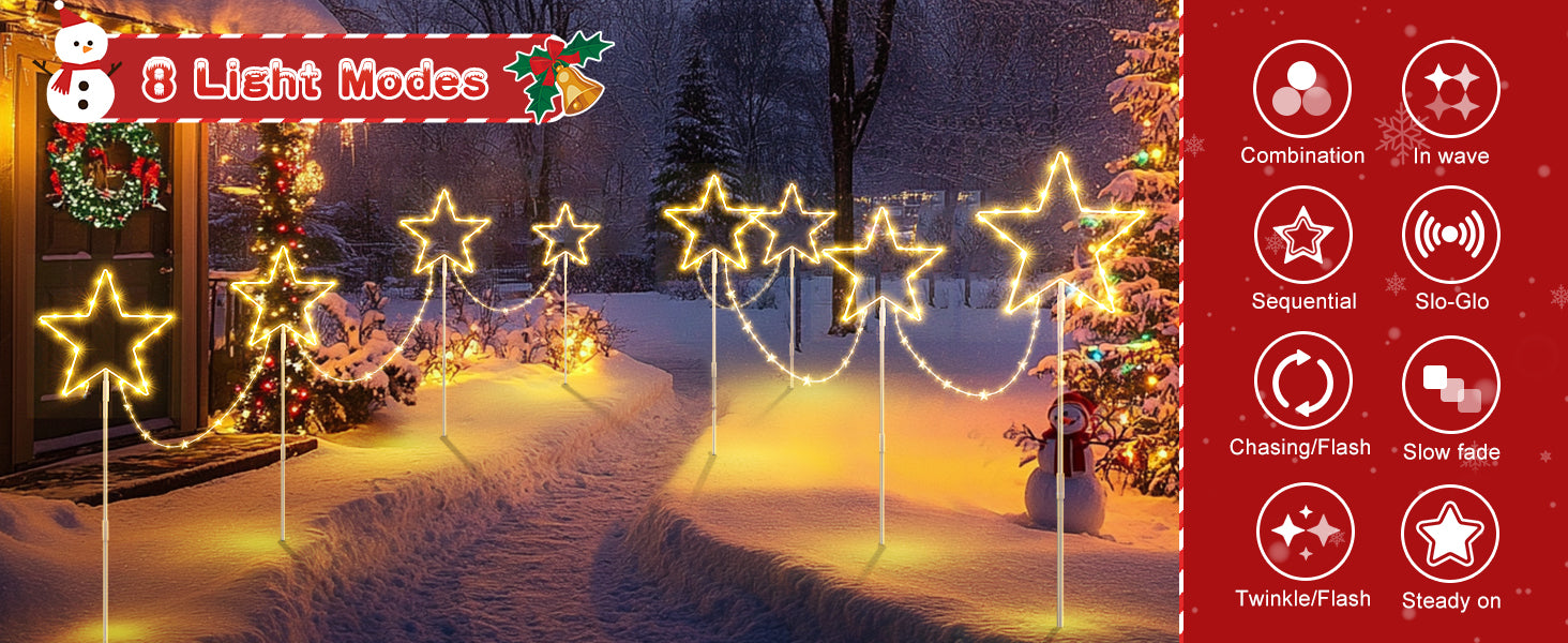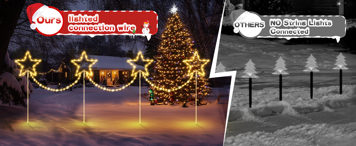 - 【ديكور عيد الميلاد المثالي】حوّل حديقتك إلى أرض عجائب احتفالية مع Quntis أضواء عيد الميلاد الخارجية! لقد قمنا بتغيير الأسلاك المتصلة بين كل ضوء نجمة إلى أضواء خيطية، والمجموعة الكاملة تحتوي على 144 LED، مما يجعلها أكثر دفئًا ورومانسية ولها تأثير زخرفي أفضل. هذه الأضواء الجميلة مناسبة لتزيين حديقتك، ومسارك، وعشبك، وشرفتك، ورصيفك، وممر سيارتك. الأضواء الدافئة لا تضيء فقط الطريق إلى المنزل، بل تسعد أيضًا جيرانك وضيوفك.