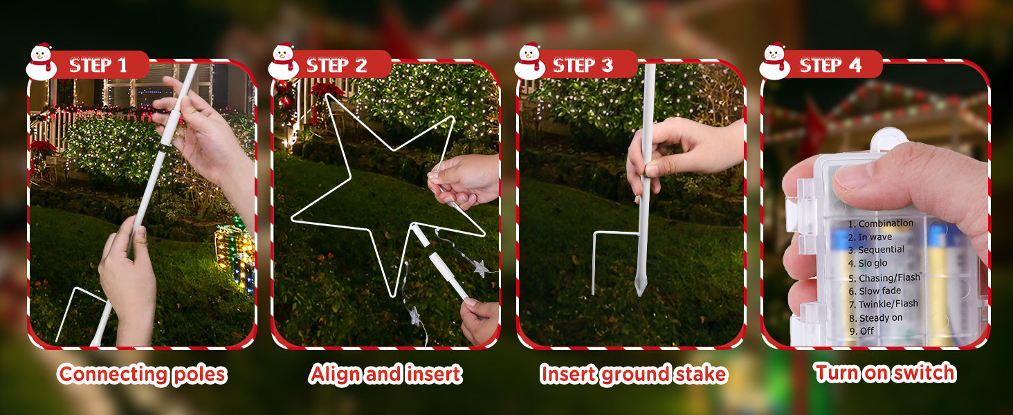 - 【سهل التركيب】وداعًا للإعدادات المعقدة، تم تصميم أضواء عيد الميلاد الخارجية من Quntis مع مراعاة سهولة الاستخدام، مقسمة إلى ثلاثة أجزاء لتسهيل التجميع والتفكيك. يحتوي كل جزء على 1x أضواء نجمة عيد الميلاد + 1x عمود تمديد بطول 30 سم + 1x وتد أرضي بطول 30 سم. قم بتزيين ممر سيارتك أو الرصيف بهذه الأضواء الزخرفية لعيد الميلاد واستقبل قدوم موسم العطلات.
