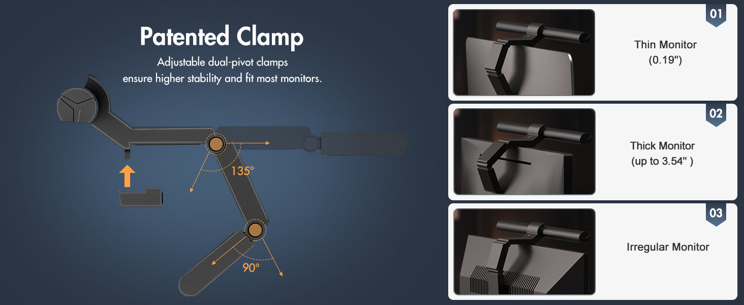 আমাদের নতুন তিন-অংশের কাউন্টারওয়েট ক্ল্যাম্প 1000R পর্যন্ত বাঁকা মনিটরের জন্য নিখুঁত! এতে অনন্য সমন্বয় প্যাড এবং একটি সামঞ্জস্যযোগ্য ডুয়াল-অ্যাক্সিস ক্ল্যাম্প প্লাস রয়েছে যা 0.19 ইঞ্চি থেকে 3.54 ইঞ্চি পুরু বেশিরভাগ মনিটরের জন্য উপযুক্ত।