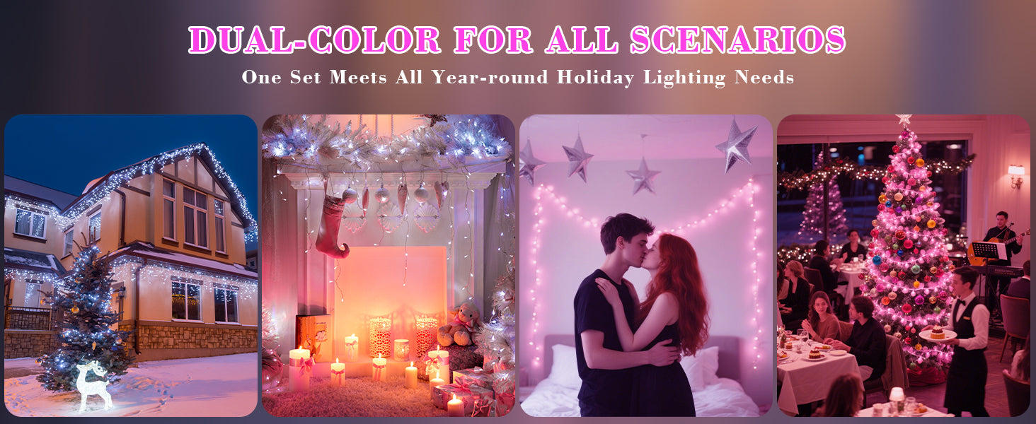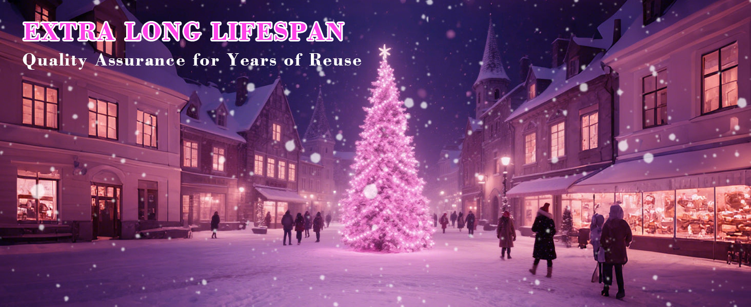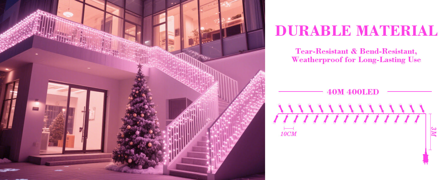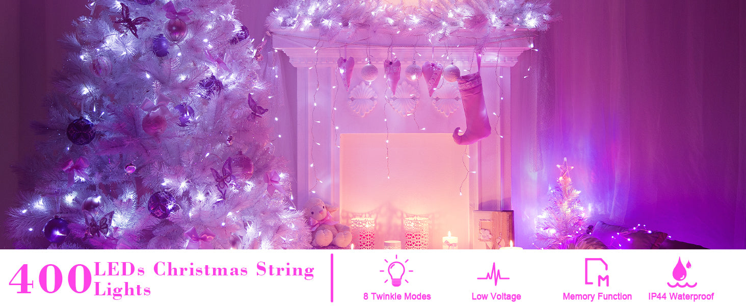 Fairy Lights- 40M 400LED Christmas Fairy Lights :Crafted with 400 vibrant LEDs and a 43M transparent cable (40M main string + 3M lead wire), these pink-and-white bi-color fairy lights are designed to elevate your white Christmas tree. The soft blend of pink and white creates a whimsical contrast, making your tree the standout centerpiece of your holiday decor!