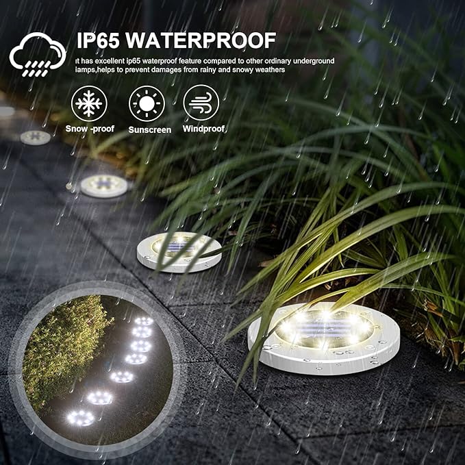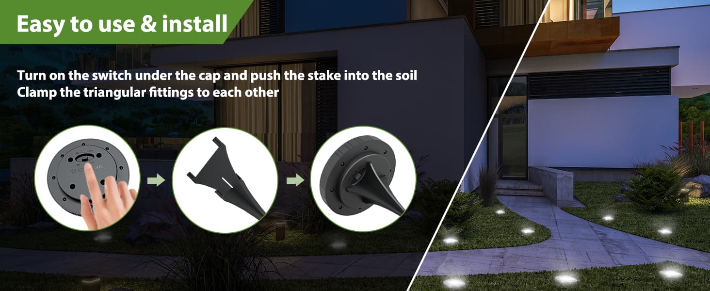 Unsere Außenlichter verfügen über ein einfach zu installierendes Design, wobei jedes Licht zwei Halterungen enthält, die mühelos in den Boden oder andere Außenflächen gedrückt werden können. Diese langlebigen solarbetriebenen Bodenlichter können bis zu 200 kg Gewicht aushalten, was sicherstellt, dass sie jahrelang halten.