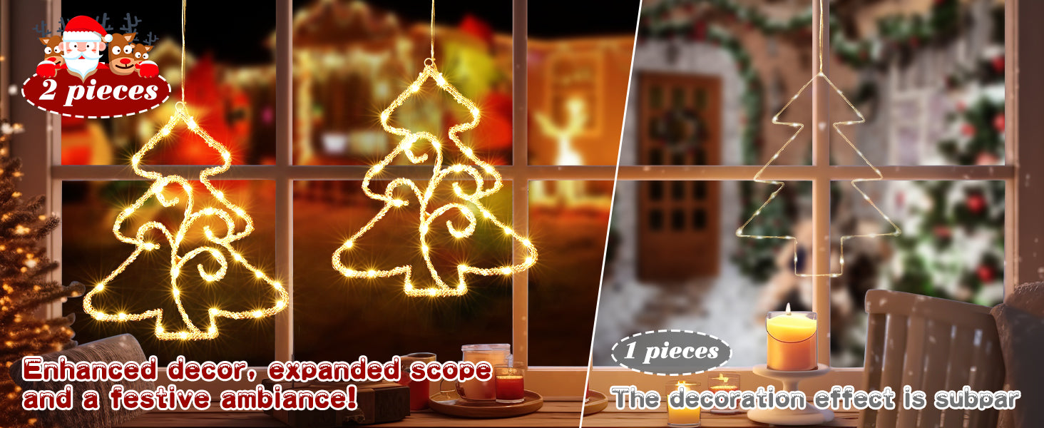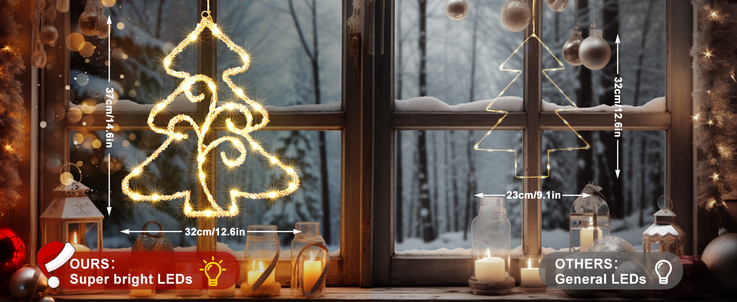 - 【2er Set Weihnachtsfensterlichter】Im Gegensatz zu gewöhnlichen Weihnachtsfensterlichtern können die Quntis Weihnachtsfensterlichter einen kristallartigen funkelnden Halo ausstrahlen, der Ihre Nachbarn begeistern wird. Jedes Licht besteht aus 70 warmweißen LEDs, insgesamt also 140 LEDs, um Ihr Weihnachten zu erleuchten. Die Größe der Weihnachtsfensterlichter kann bis zu 14,5 Zoll betragen, 2-teiliges Set für einen besseren Dekorationseffekt und einen größeren dekorativen Bereich, kann Ihre verschiedenen Fenster perfekt dekorieren.