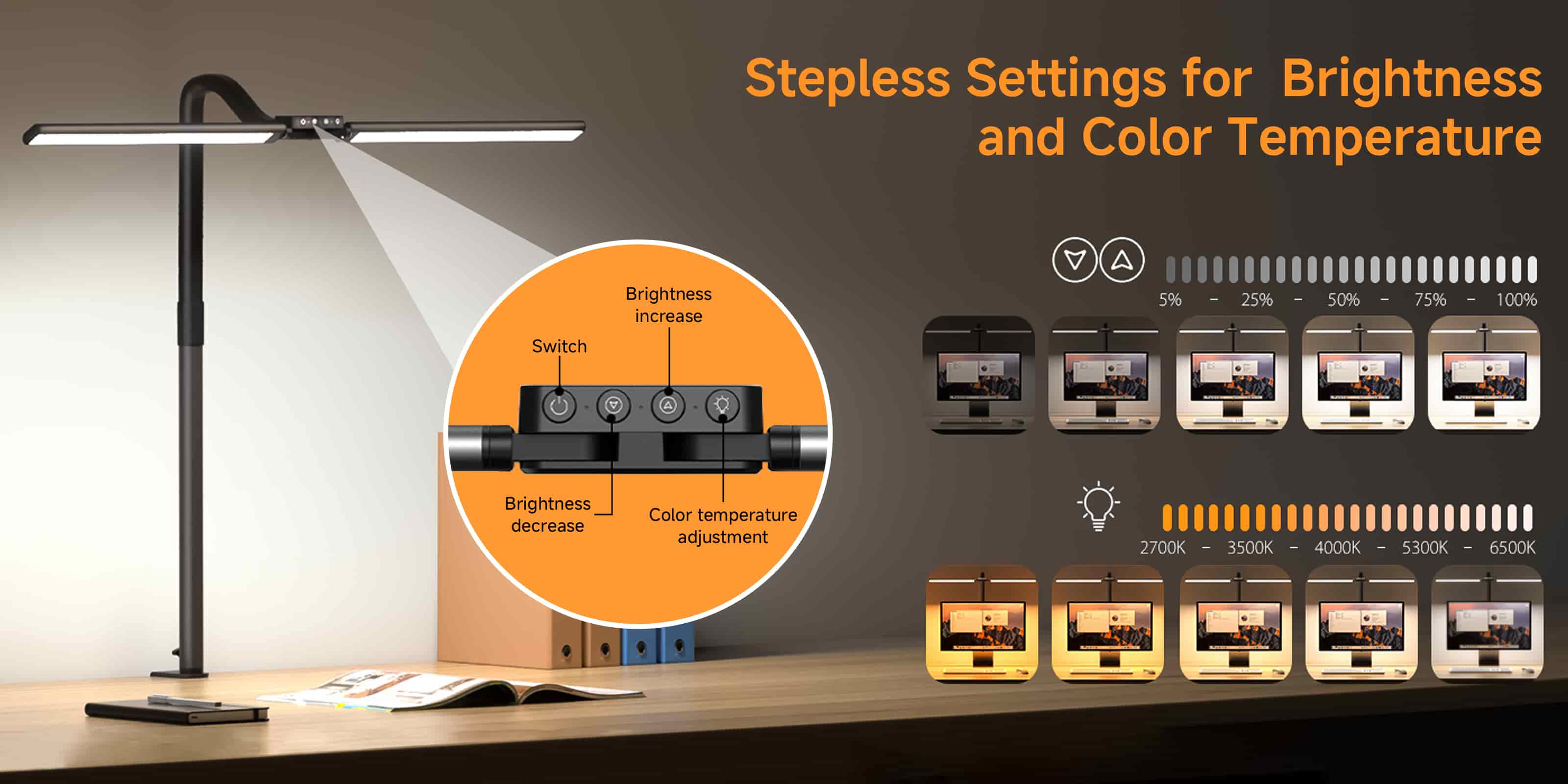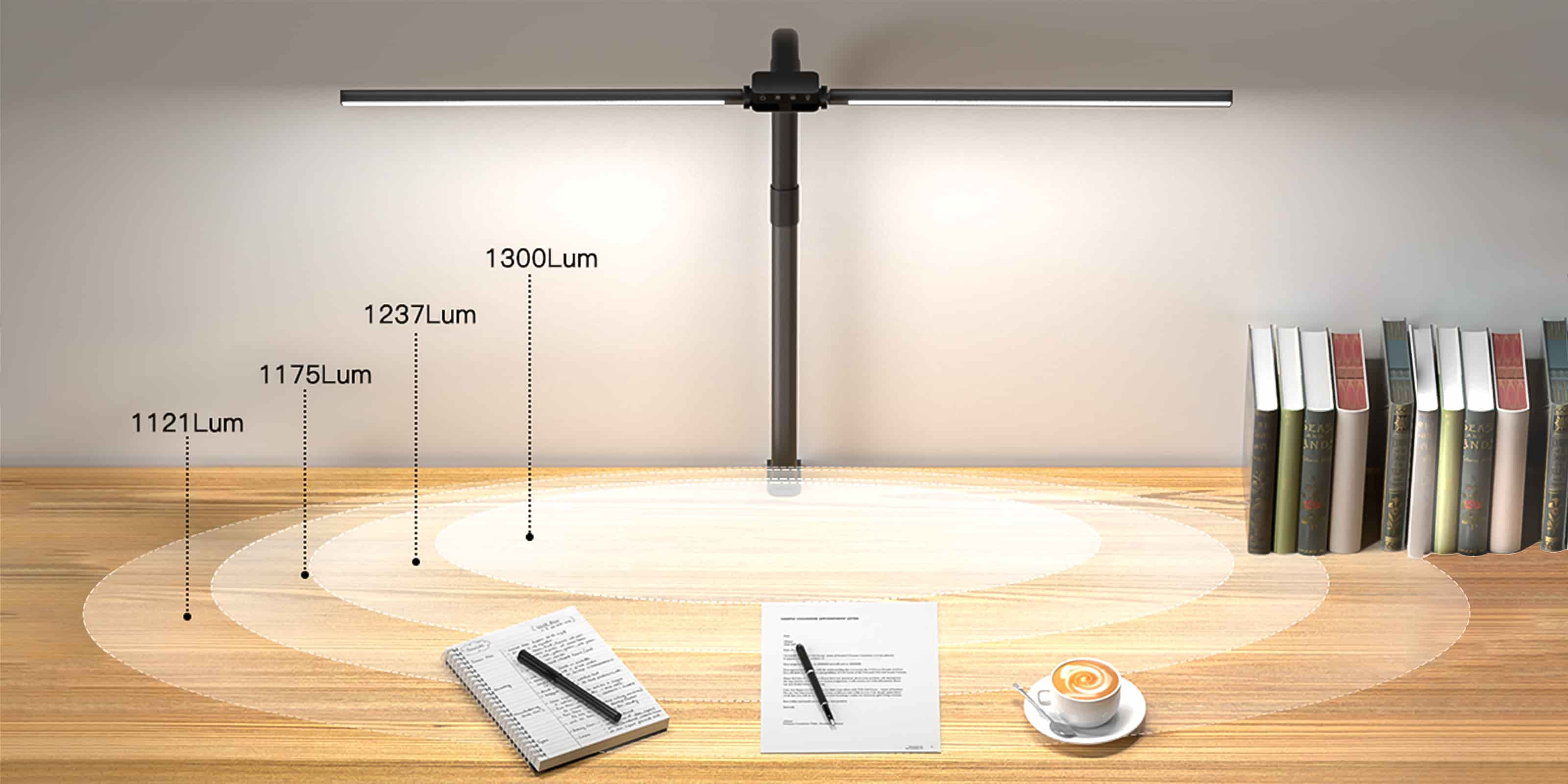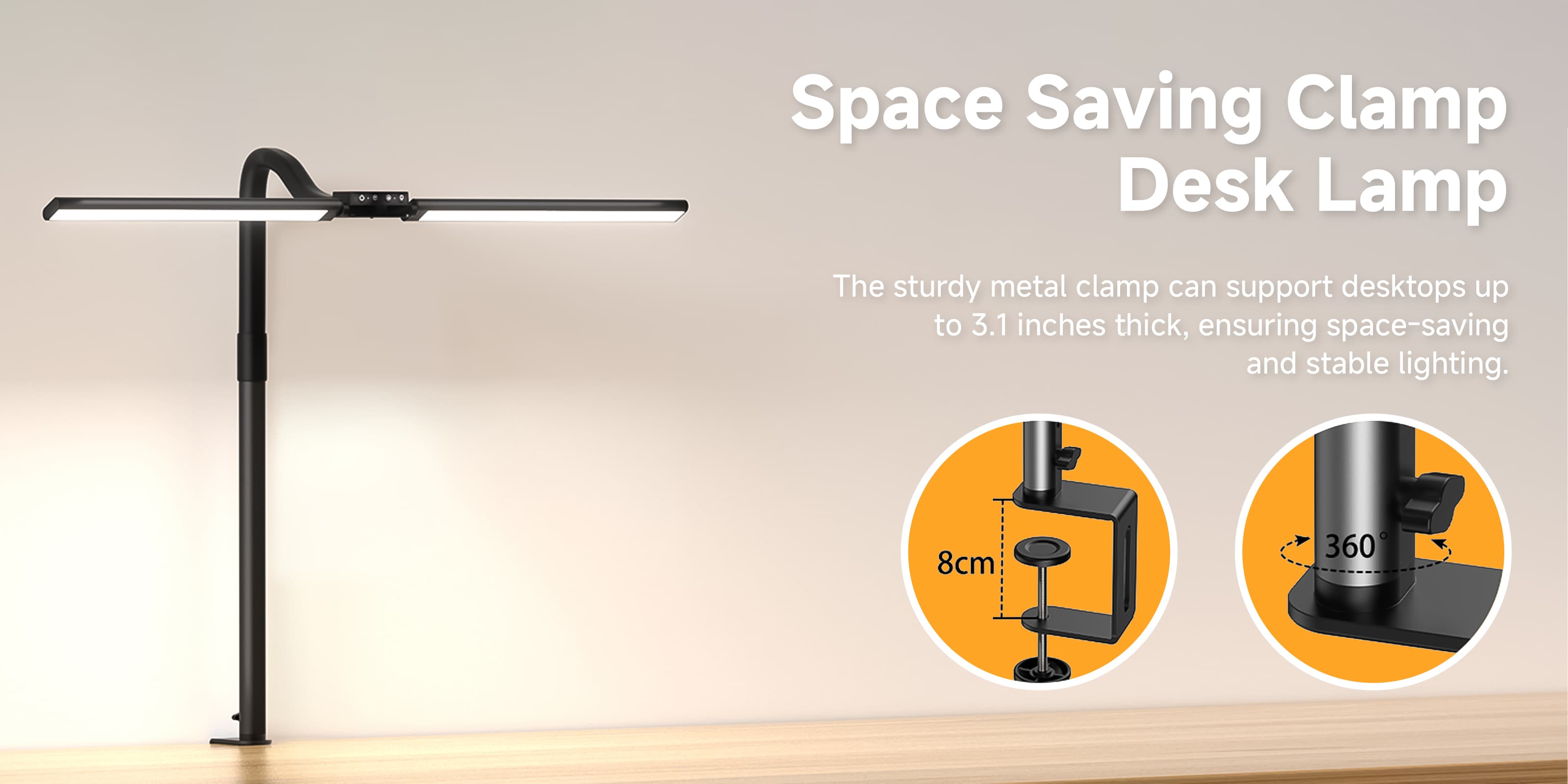 - 【Ultra Wide Design】Die Lampe verfügt über ein verstellbares Doppelkopfdesign, das bei vollständiger Ausdehnung einen großzügigen Spannbereich von 30,7 Zoll bietet. Dieses Design sorgt für gleichmäßige und schattenfreie Beleuchtung über den gesamten Schreibtisch, wodurch sie sich für große Werkbänke, L-förmige Schreibtische, Multi-Monitor-Arbeitsplätze und gebogene Monitore eignet.