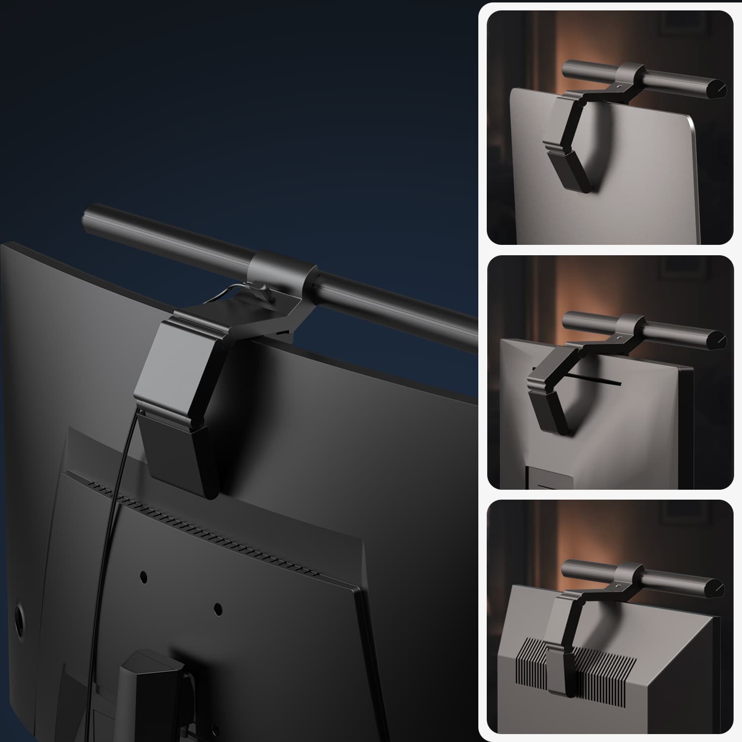 Das Quntis HY210 Displaylicht verfügt über einen dreistufigen Schwerkraftklemmen und Hilfsklemmen für gebogene Displays (bis zu 1000R). Verstellbare Dual-Achsen-Klemmen bieten hohe Stabilität und unterstützen fast alle Displays (Dicke 0,5 cm~9 cm). Das L-förmige USB-C-Eingangskabel sichert den Platz an der Klemme und sorgt für eine gut konfigurierte Position. Sie können auch mehrere HY210 Lichtleisten mit einer drahtlosen Fernbedienung steuern.