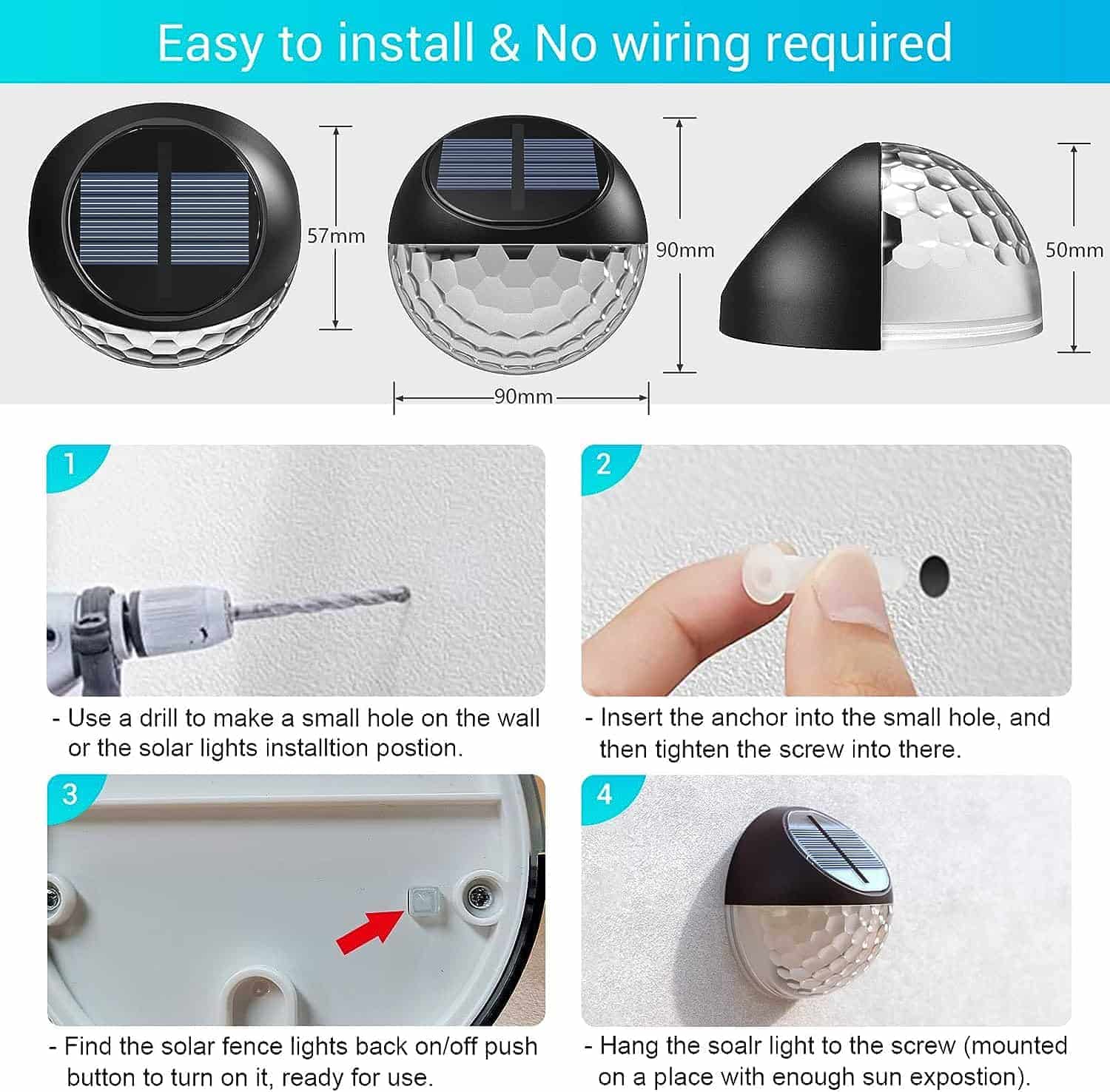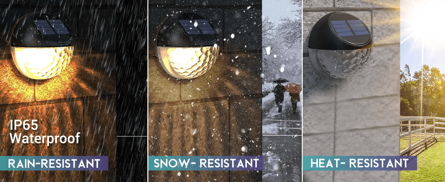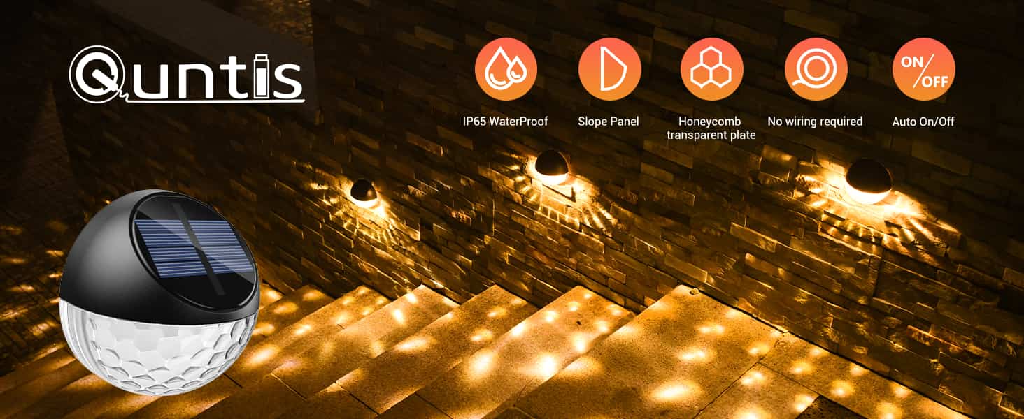 Wenn Sie einige Solarlichter benötigen, um eine sanfte und elegante Atmosphäre zu schaffen. Wählen Sie Quntis Solar-Wandleuchten, energieeffiziente, helle Lichter, die von Solarpanels betrieben werden. Hängen Sie diese Solarlichter mit Vertrauen als Zaunlichter, Decklichter, Gartenlichter, Veranda-Lichter, Balkonlichter, Decklichter, Geländerlichter, Außenwandleuchten auf, um eine einladende Atmosphäre für jeden Außenbereich zu schaffen.