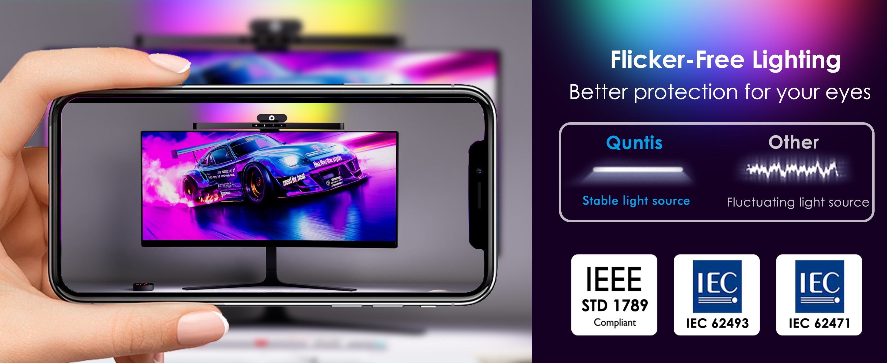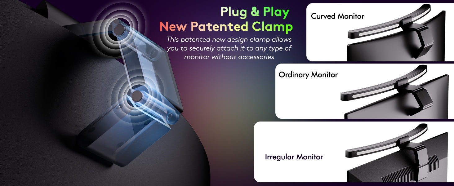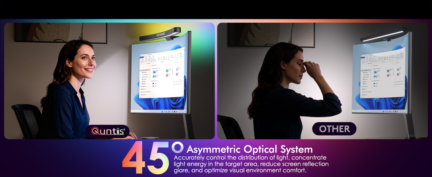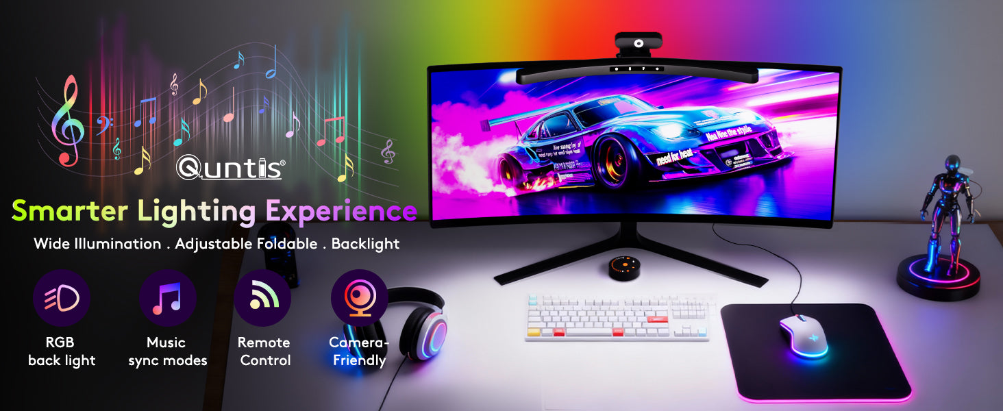 Designed for curved screens, Quntis RGB backlight eye-care lamp with adjustable brightness, color temperature, and 11 RGB modes, energy-efficient and eye-friendly.