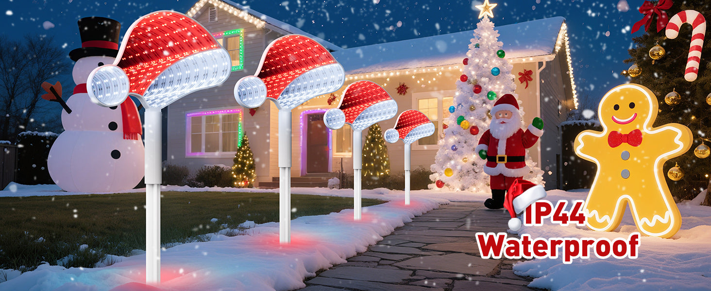 Built for outdoor use, these 3D mirror Santa hat stake lights feature an IP44 waterproof rating, making them resistant to rain and snow