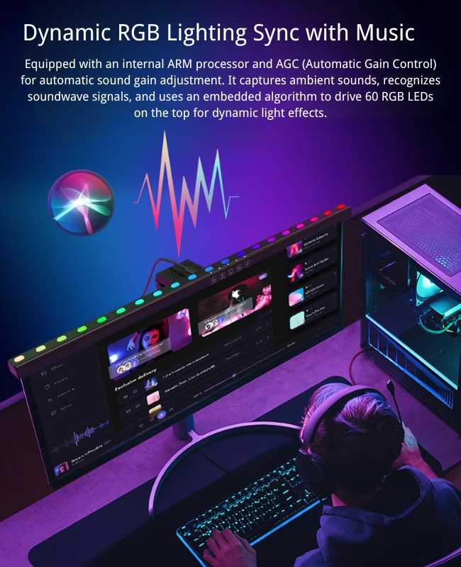 Equipado con un procesador ARM interno y AGC (Control Automático de Ganancia) para el ajuste automático de ganancia de sonido. Captura sonidos ambientales, reconoce señales de ondas sonoras y utiliza un algoritmo integrado para controlar 60 LED RGB en la parte superior para efectos de luz dinámicos.