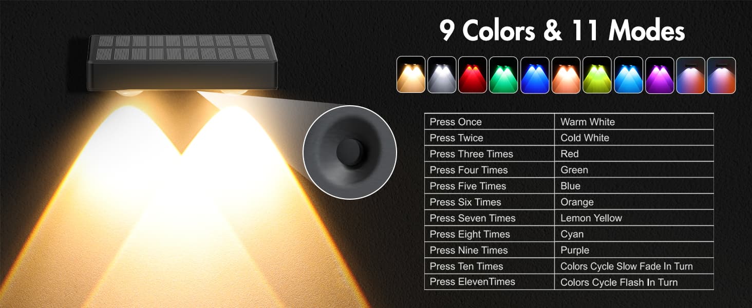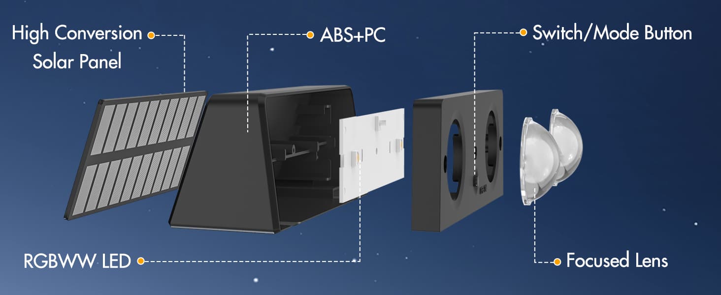 - 9 ठोस रंग और 4 प्रकाश मोड RGBWW सौर लाइट्स