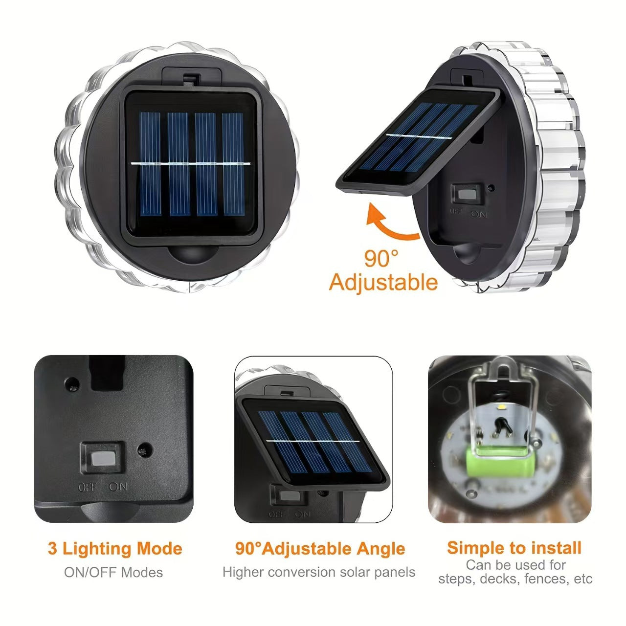 Features 90° adjustable angle, 3 lighting modes, and upgraded solar panels. Easy to install and perfect for lighting steps, decks, fences, and more.