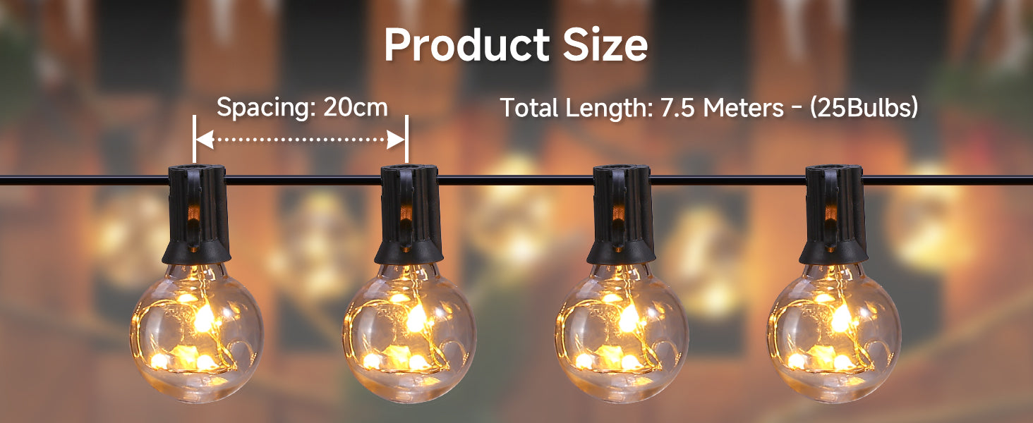 With a 7.9-inch (20 cm) bulb spacing and a total length of 7.5 meters (24.6 ft), this string light provides just the right coverage for patios, balconies, pergolas, or gardens. It includes 25 G40 bulbs plus 1 spare, ensuring long-term use without worries.