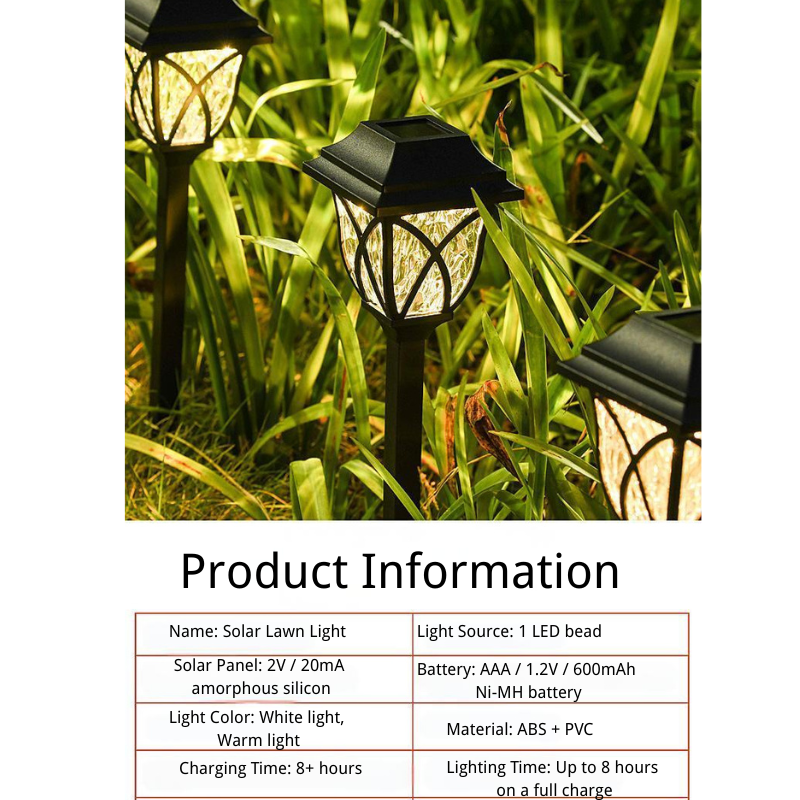 This solar lawn light features an amorphous silicon panel, Ni-MH battery, and 1 LED bead in white or warm light. It charges in 8+ hours and lights up automatically at night for up to 8 hours. Durable ABS+PVC housing, perfect for outdoor use.