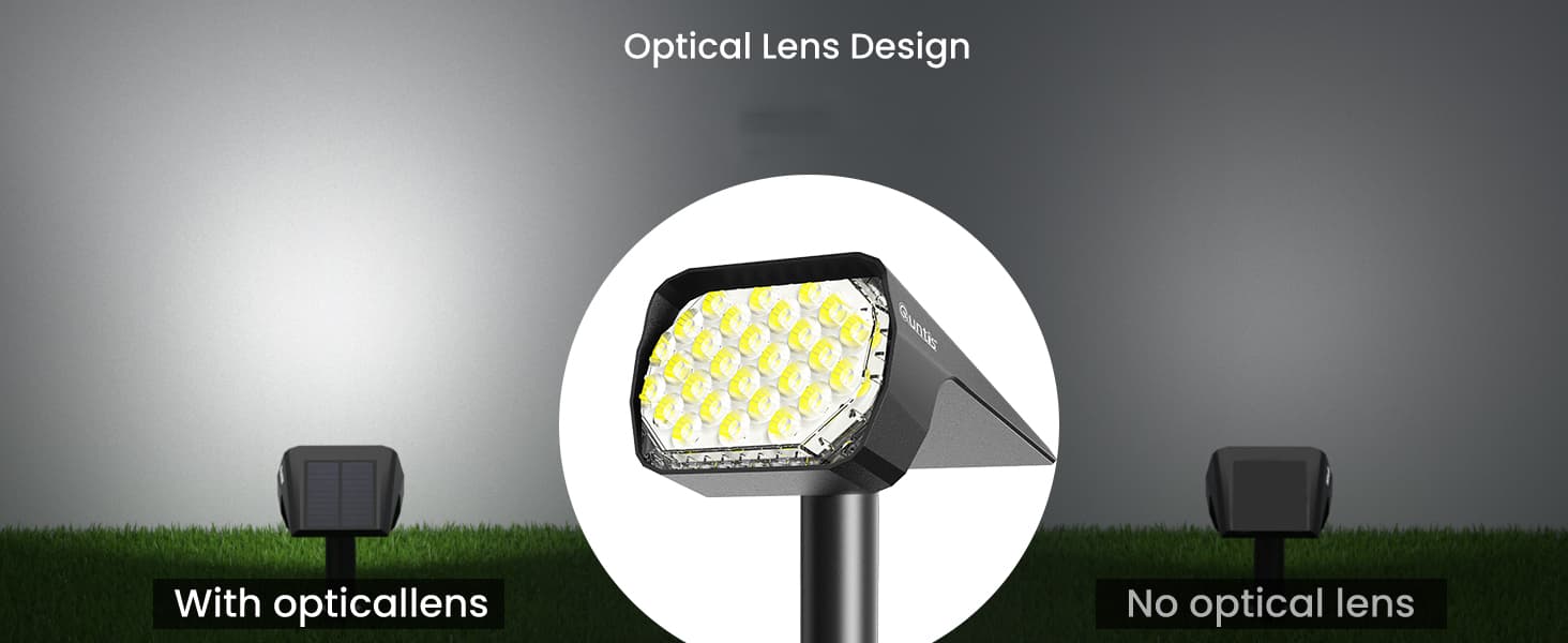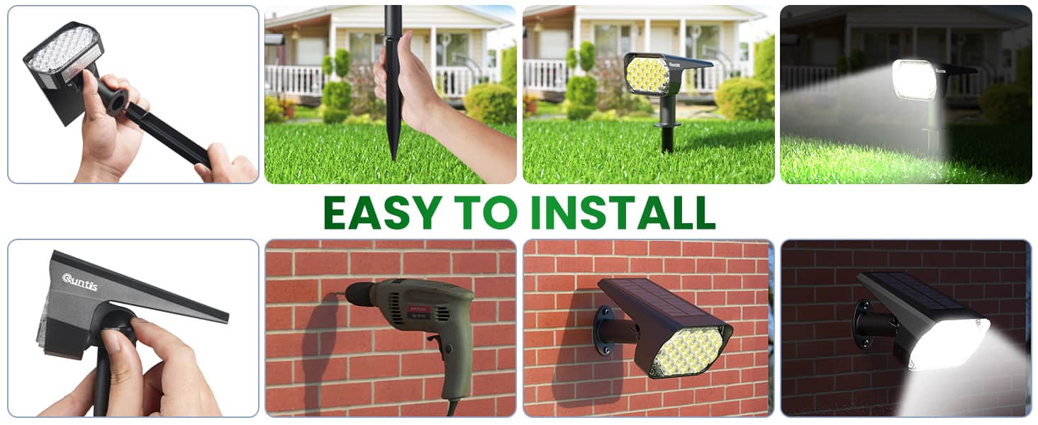 2つの明るさ照明モード: Quntisのソーラーランドスケープライトは、高輝度モード(100%の明るさ/最大6時間)と低輝度モード(45%の明るさ/最大12時間)を備えています。スマート機能のおかげで、バッテリーが低下すると明るさが自動的に減少します。日光で充電し、毎晩あなたの家を明るく照らします(ソーラーパネルに軒や木などの影がないことを確認してください)。