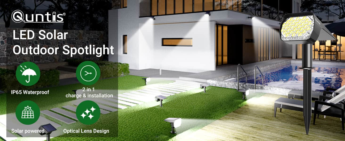 過酷な天候を恐れない: IP65防水で、高級ABS素材で作られており、屋外のソーラーライトは、暴風雨/高温/極寒などの悪天候に耐えることができます。Quntisのソーラーランドスケープスポットライトで、どんな天候でもあなたの庭や通路を明るく照らすことができます。