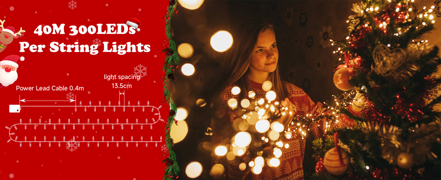 Stretching 40 meters and equipped with 300 high-brightness LED bulbs, this fairy lights string provides abundant, sparkling illumination. Perfect for decorating large trees, patios, or indoor spaces, it creates a festive and magical holiday atmosphere.