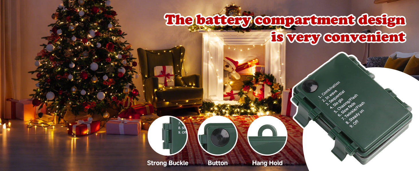The thoughtfully designed battery box makes replacing batteries quick and hassle-free. Compact and easy to use, it ensures your fairy lights stay powered throughout the holiday season without interrupting your decorations.