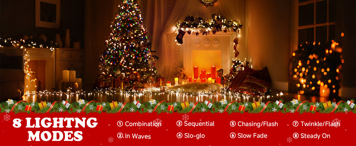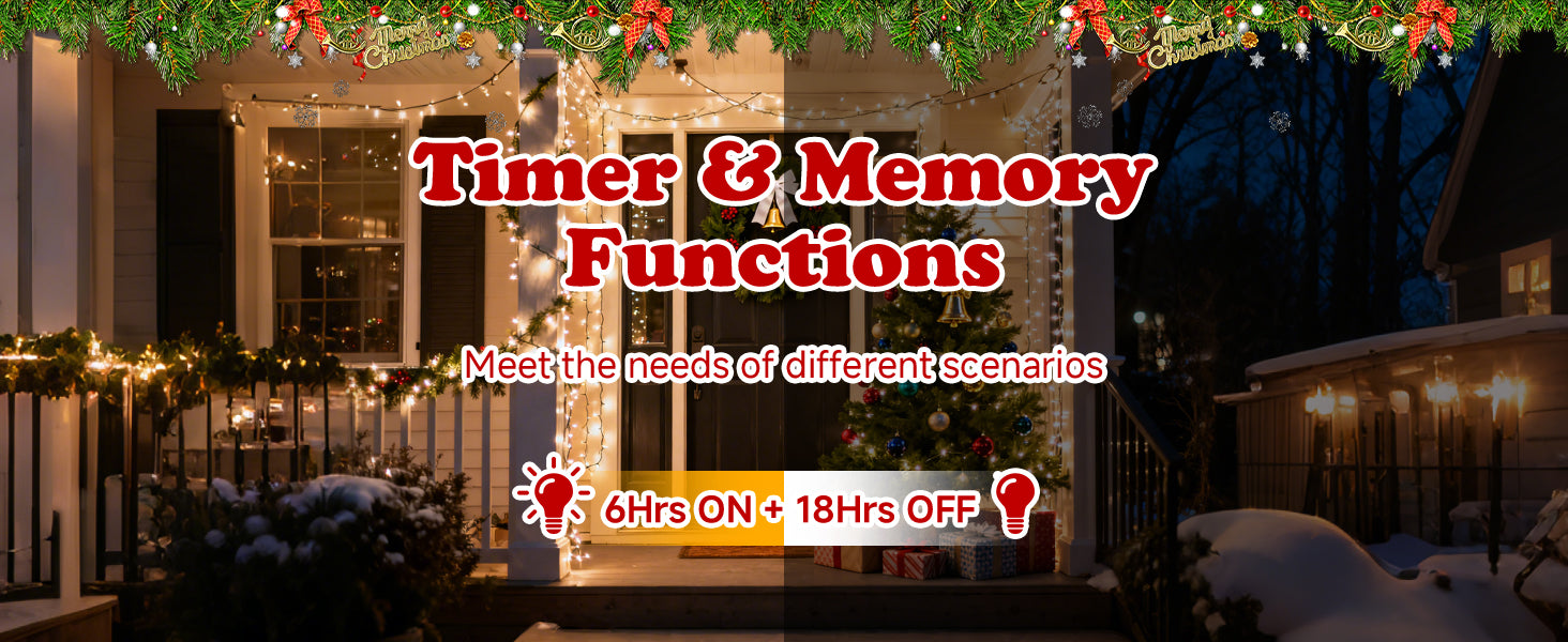 Choose from 8 enchanting lighting modes to create the perfect holiday atmosphere—from steady glow to twinkling sparkle. With a built-in memory function, the lights automatically remember your last setting, saving you the trouble of resetting every time you turn them on.