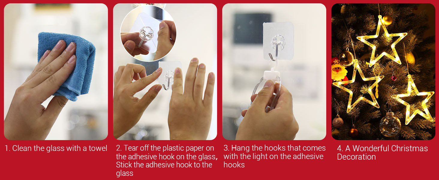 - 【Easy to install—Won’t fall down】 Our window star light comes with 8 super-sticky non-marking sticker hooks, which can be easily installed on windows, doors, cabinets, wall etc. The height can be adjusted to any fixed position, creating a beautiful shape. By using the non-marking sticker hook, you can install the fairy light without drilling holes in the wall, perfectly protecting your wall from damage. Tips: Please use non-marking stickers on a clean and seamless surface.