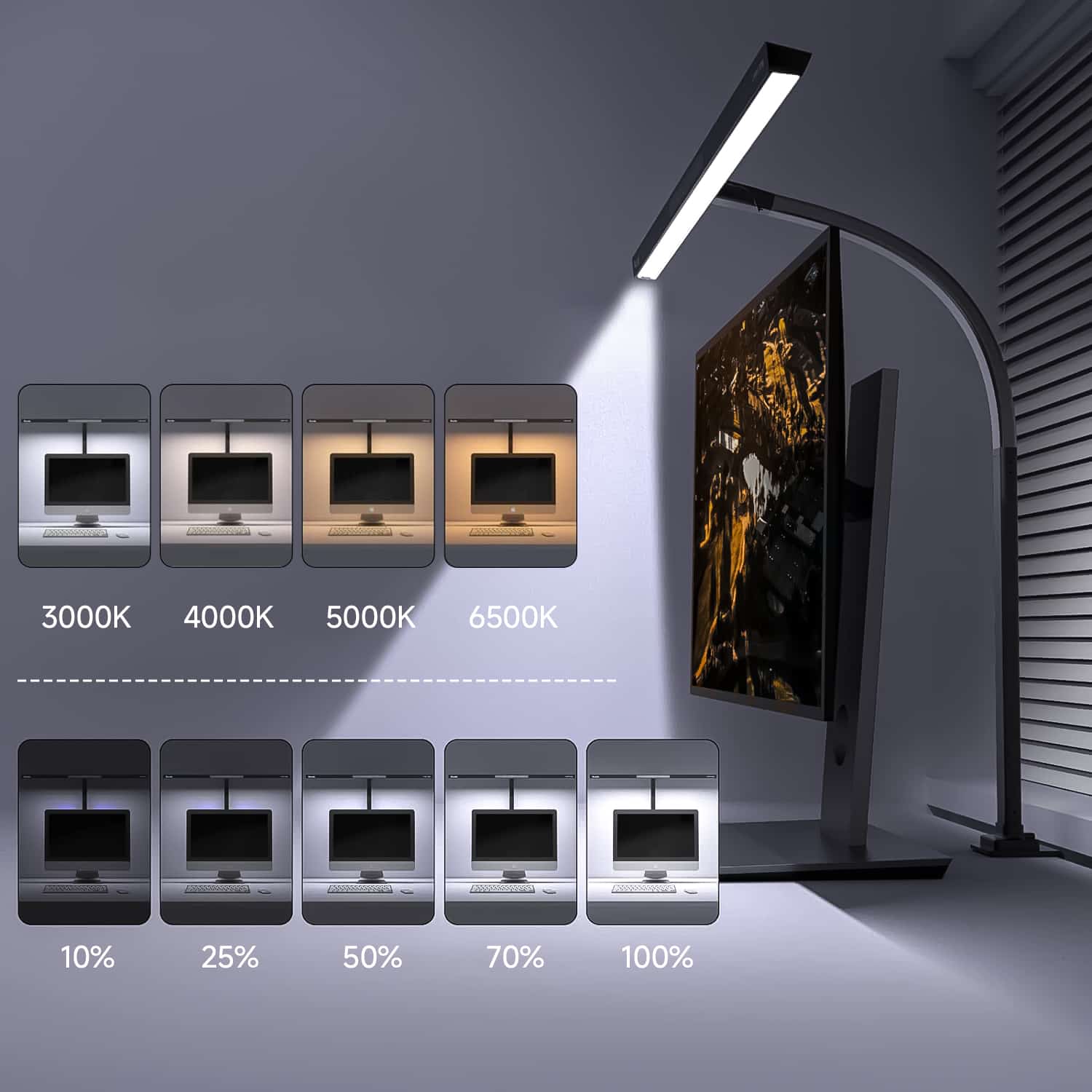 【360°Flexible gooseneck & Super Stable Clamp】 The monitor light bar with clamp is carefully crafted to make it more secure and stable.The computer monitor light features a long neck that swivels and bends, allowing you to focus work at the perfect angle. The silicone gooseneck design is easy to locate and can be flexibly adjusted to evenly cover the desktop. The clamp of the task lamp design supports a maximum desktop thickness of 10.2cm and fits perfectly with your overall desktop.