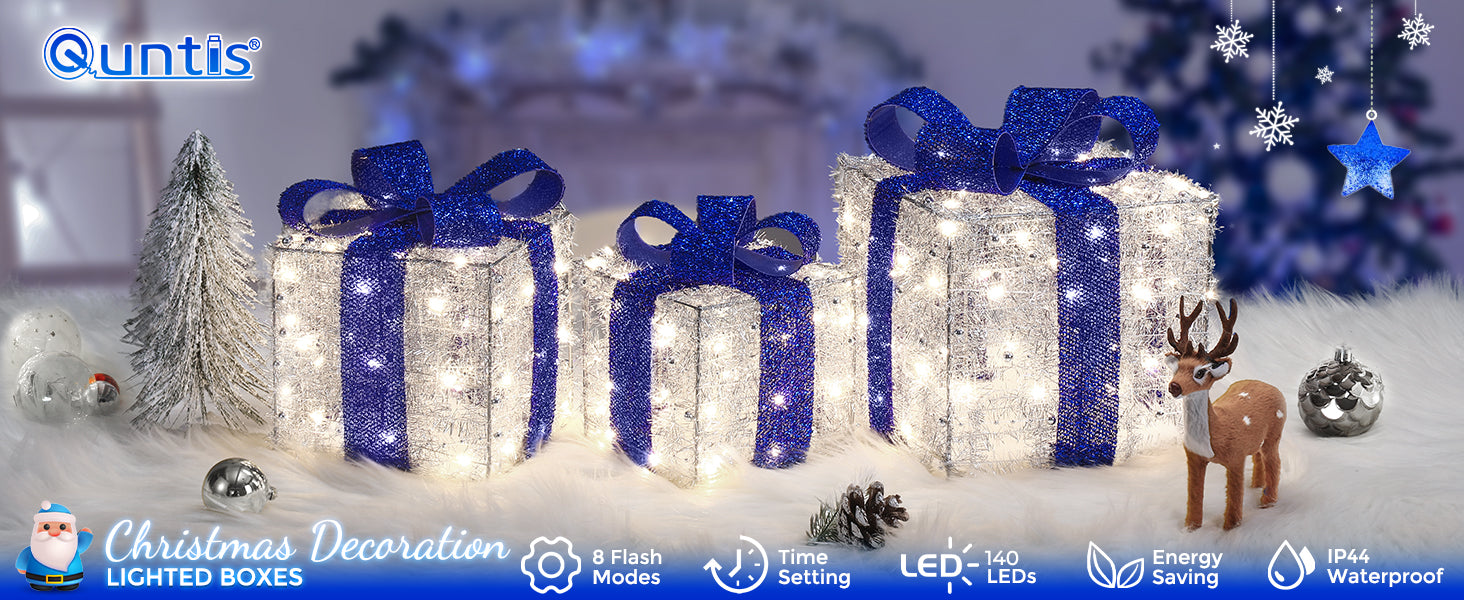 Unique Blue-Themed Christmas Lights Design: This blue Christmas decoration embodies Quntis's exclusive creativity, featuring Christmas Lights centered within a silver metal frame. Glitter blue ribbons and bows create a captivating reflective effect, while silver tinsel and bead accents enhance its brilliance. These lighted gift boxes beautifully capture the essence of a blue-themed Christmas atmosphere, making them a stunning addition to your holiday decor.