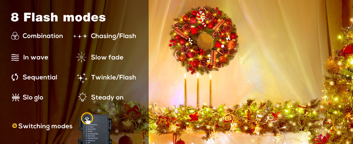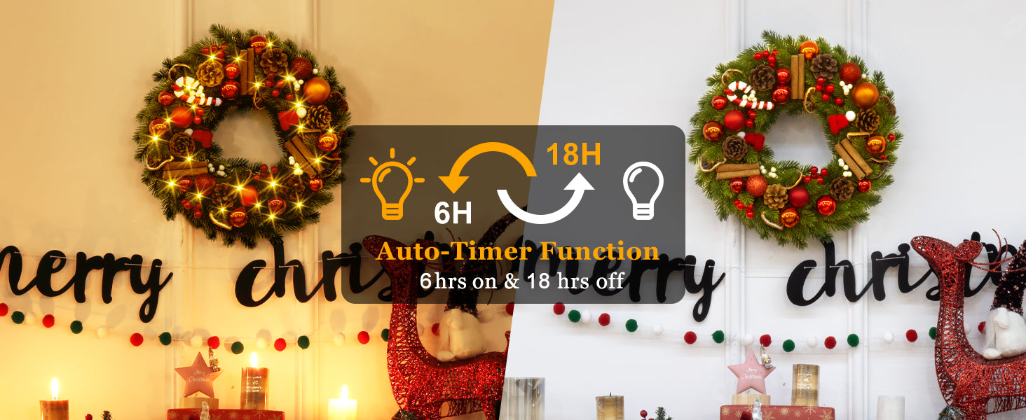 - 【8 Modes&Timer Function Xmas Wreath】Indulge in the radiance of 8 mesmerizing wreath light modes. Effortlessly infuse your space with festive charm using our smart timer: When you turn on the lights of Chirstmas decor wreath, the timer automatically starts, lights up for 6 hours, and then turns off for 18 hours.A cycle of seamless enchantment awaits. Make this Christmas truly magical!