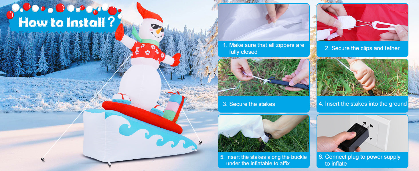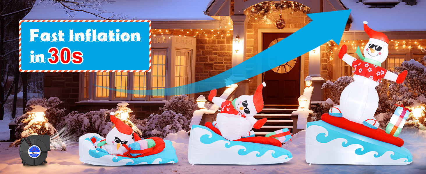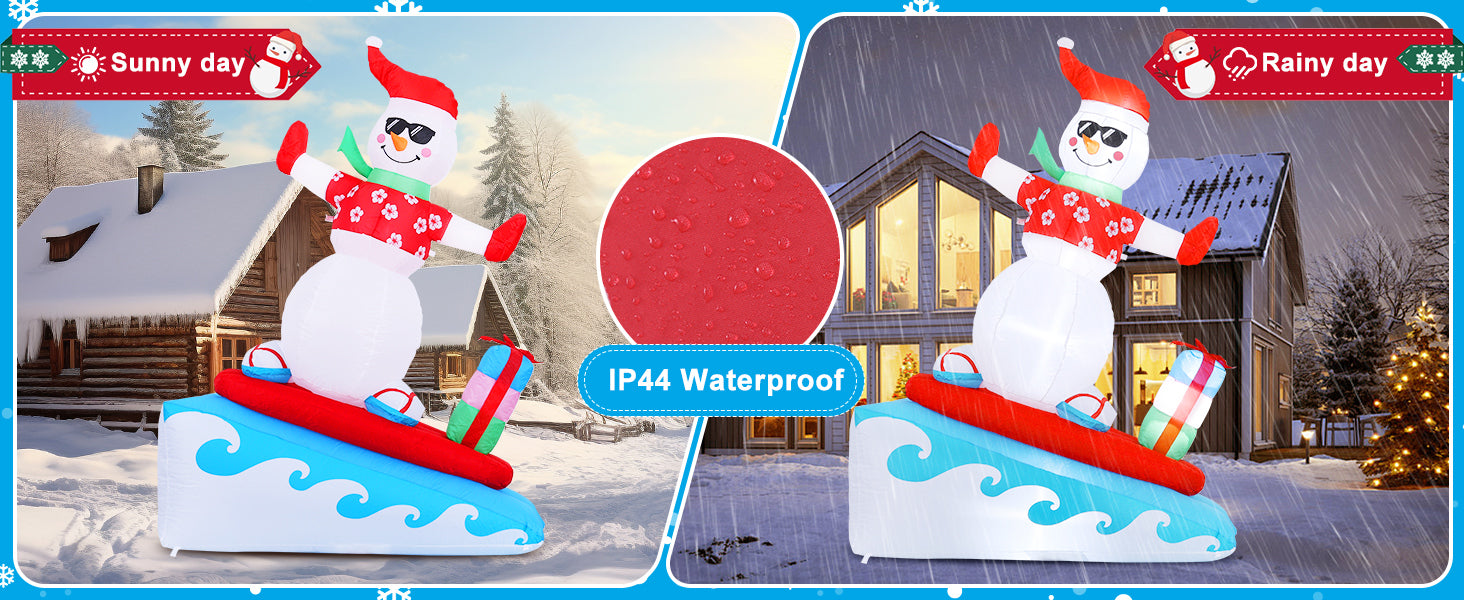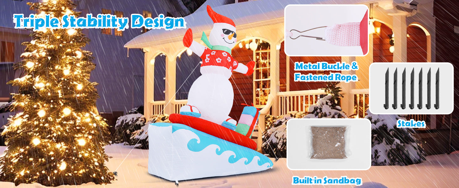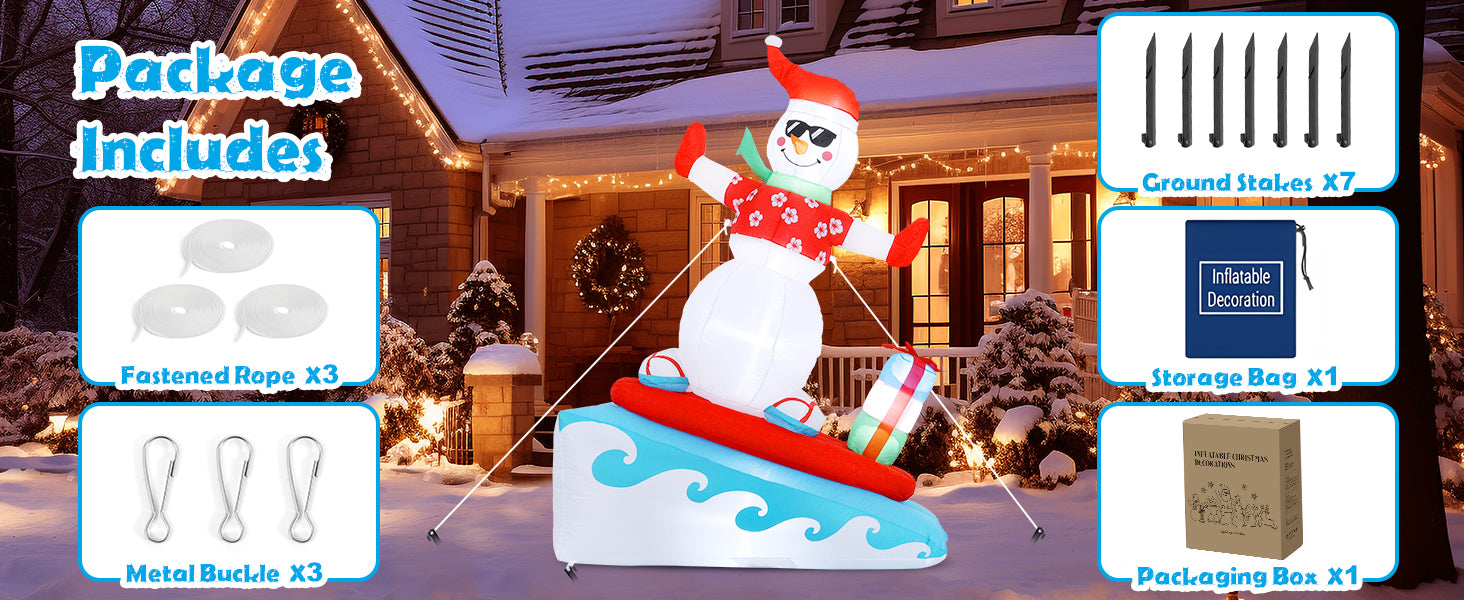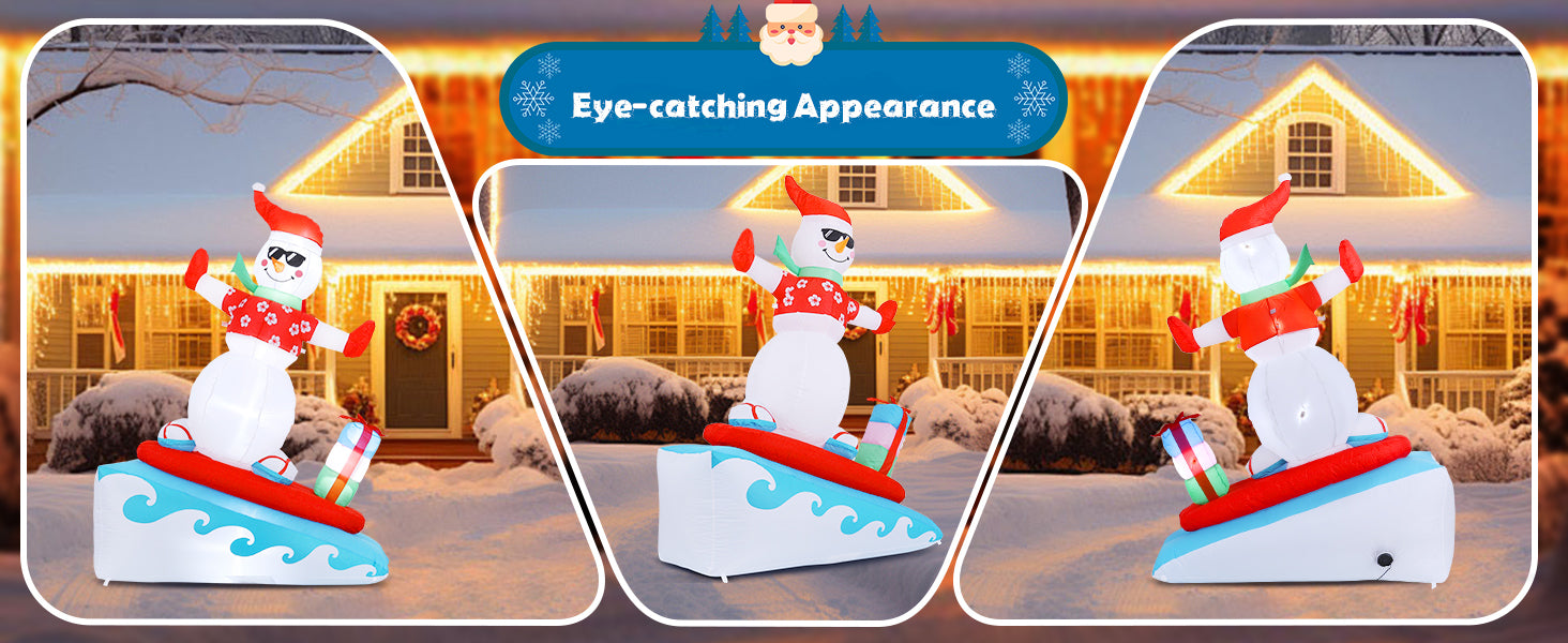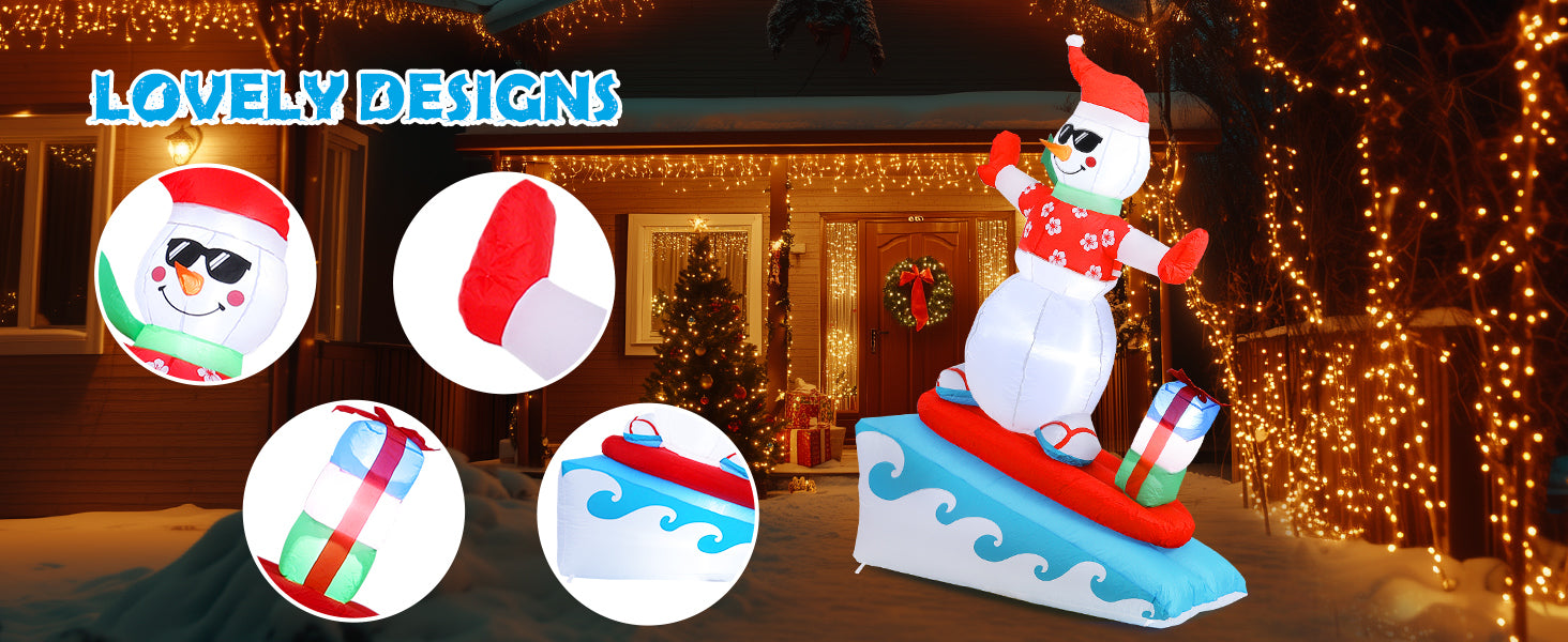 - Surfing Snowman Inflatable: This 6FT Christmas inflatable outdoor decoration seems to have just returned from surfing in the ocean and brought Christmas presents for you and your family, which will certainly give you, your family and guests a good mood. Your children may also hope to have a cute inflatable friend to accompany them at Christmas. This snowman inflatable is an ideal Christmas gift for kids, its vivid and funny appearance will make them love it at the first sight.