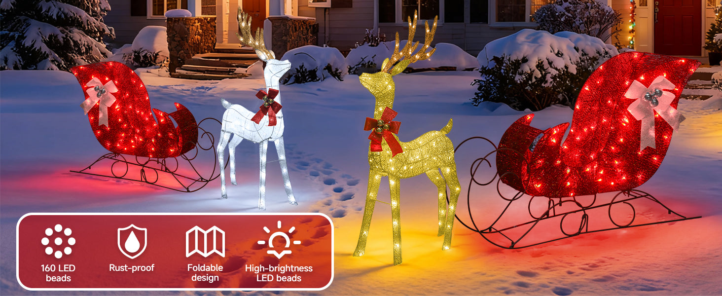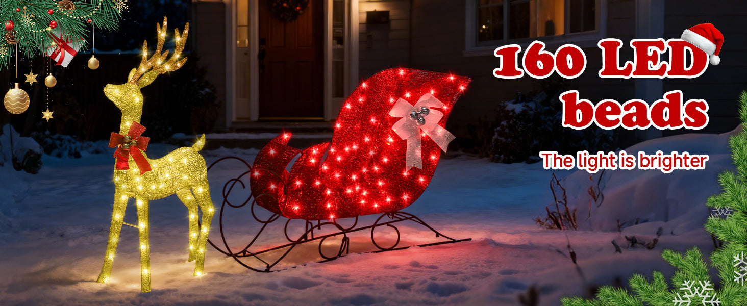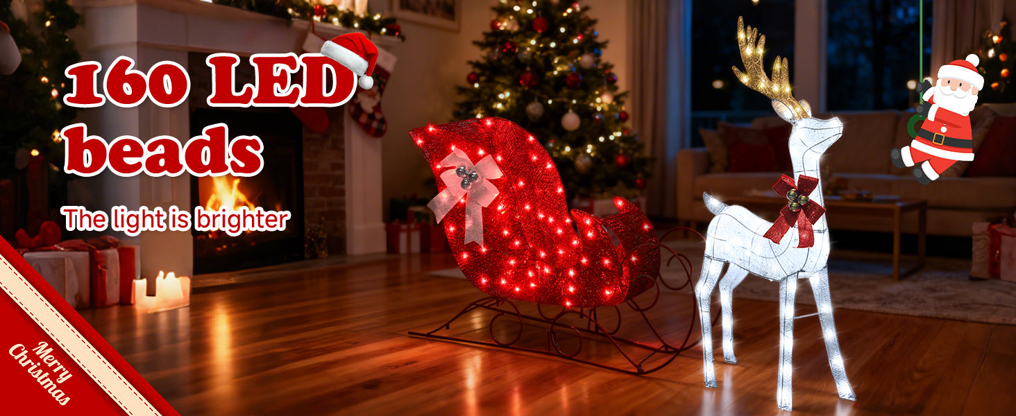 Featuring 160 high-lumen LED Christmas Lights, this Reindeer Sleigh creates a dazzling, vibrant glow. Make your Outdoor Decoration the most brilliant neighborhood showstopper.