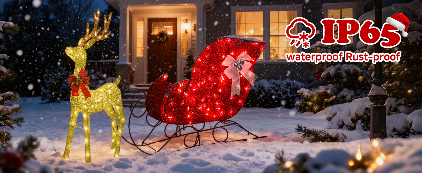 Built for the Outdoors: This large Christmas Reindeer and Sleigh set is constructed with weather-resistant materials, making it completely Rain-Proof and Freeze-Proof to withstand harsh winter elements