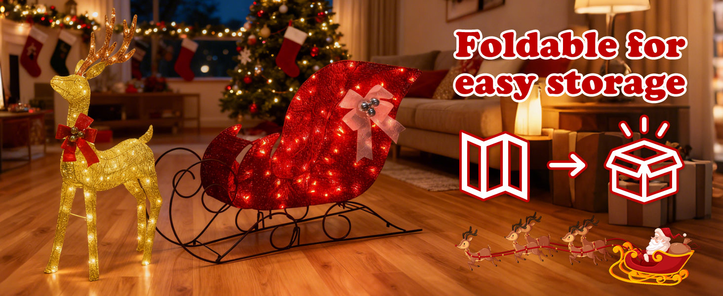 Say goodbye to bulky storage! Our Christmas Reindeer Sleigh features a clever collapsible design. Effortlessly fold the Outdoor Decoration flat for quick take-down and space-saving storage until next year.