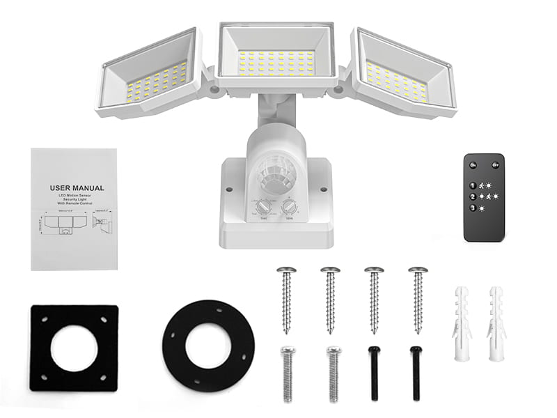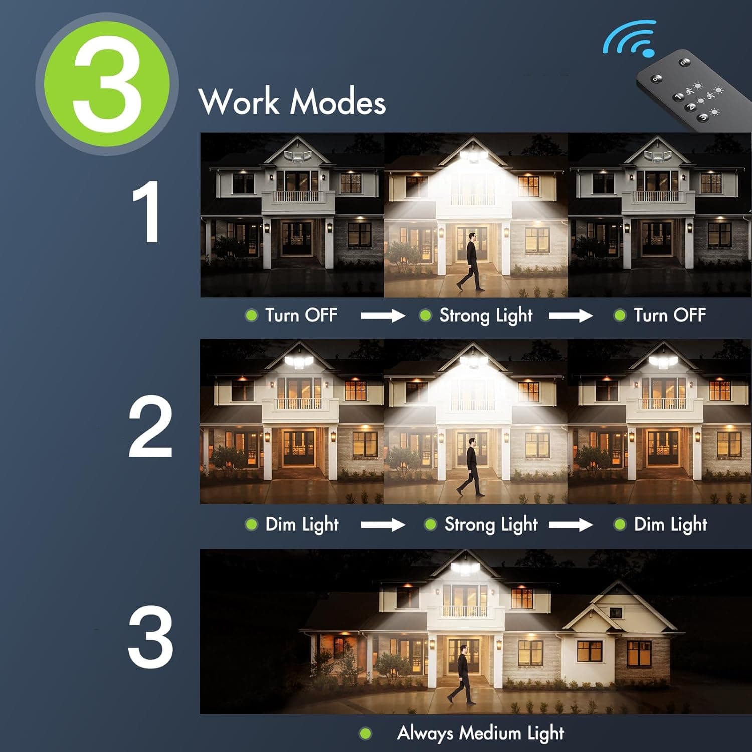 Each Quntis LED security light is equipped with a remote control. You can choose your favorite motion sensor mode faster than other flood lights: ① Off > On (Strong) > Off Mode ② Dim > Strong > Dim Mode. ③ Always On Mode (3000LM).