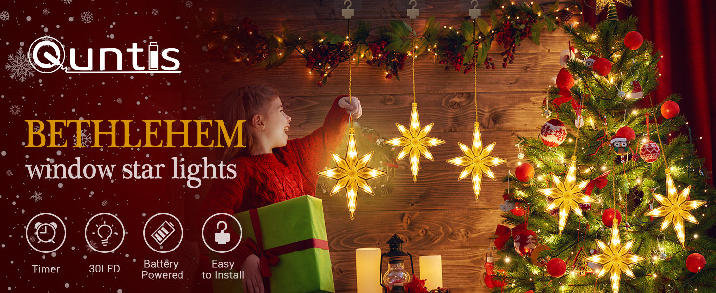 Quntis 3-in-1 Christmas Star Lights – LED Indoor & Outdoor Christmas Lights for Windows, Kitchen, Living Room, Dining Room, Warm White