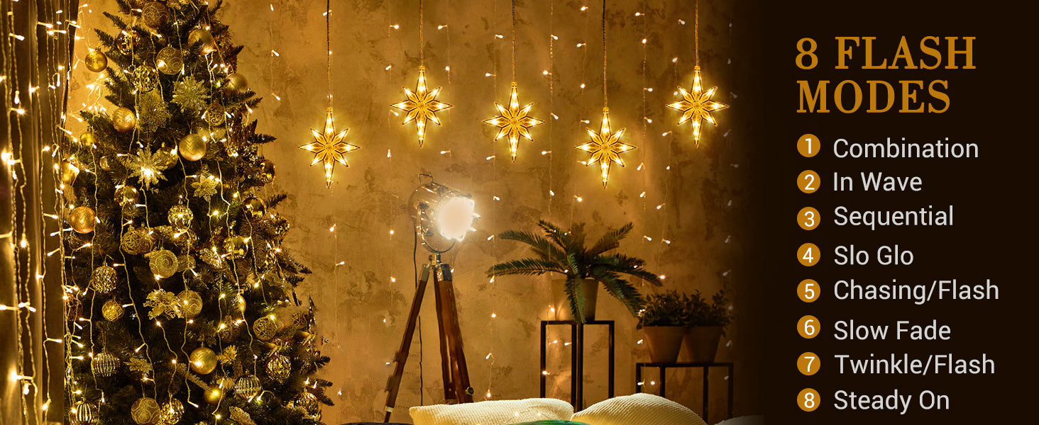 8 Flashing Modes and Timer Function for Xmas Star Window Lights