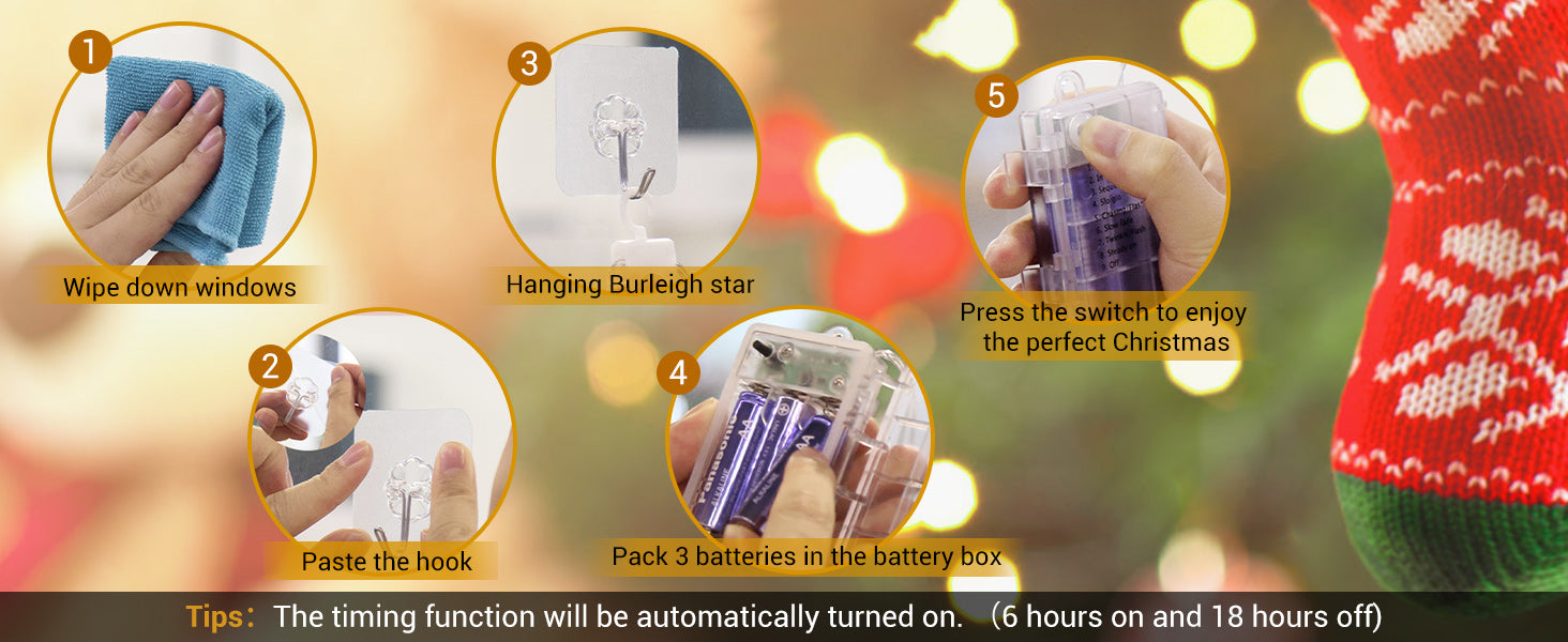 This star window light features 8 flashing modes. Imagine being under a starry light with your family; sometimes the star tree topper decoration is soft, and sometimes it's bouncing—how romantic and mysterious! Additionally, the timer function (6 hours on / 18 hours off) helps you save energy. You can control them using a switch button on the battery box.