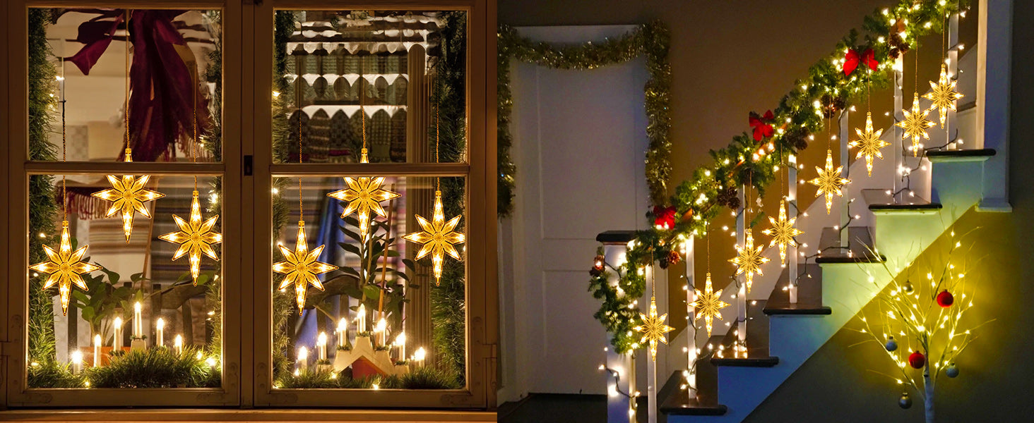 Quntis star lights for Christmas decoration come in a well-designed package, perfect for Diwali and Christmas decorations, both indoors and outdoors, as well as gifts for children. Hanging illuminated Bethlehem stars is a fun addition to your home and garden ornamentation. They are suitable for decorating glass windows, house windows, bars, interiors, exteriors, shops, and supermarkets. The bright silhouette is large enough to attract distant eyes, adding a lovely touch to Christmas.