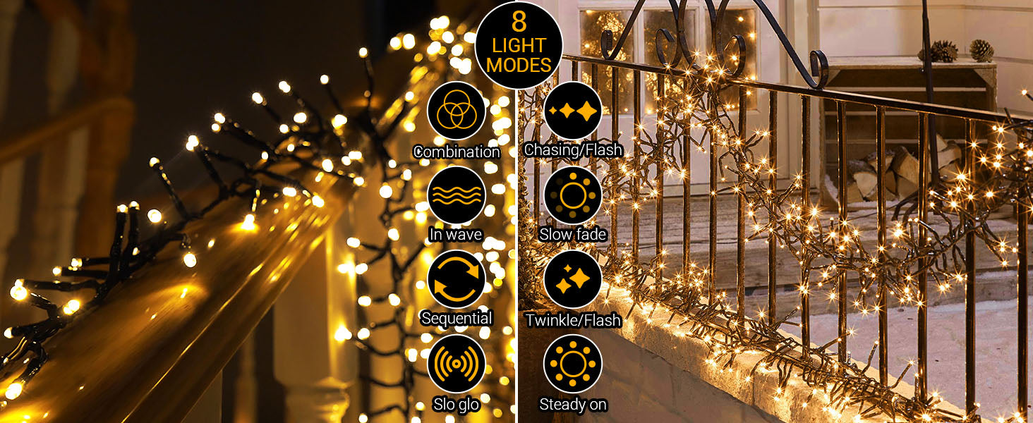 - [8 MODES & MEMORY FUNCTION] Our Christmas lights with 8 flash modes: combination, in waves, sequential, slo-glo, chasing/flash, slow fade, twinkle/flash, and steady on. Different lighting effects are controlled by the button on the plug, memory function design makes the lights will recover from the previous setting mode when you restart the lights next time.