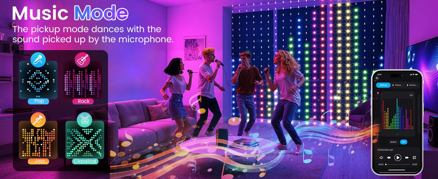 Quntis RGB Curtain Lights come with a built-in sound-activated feature, allowing the lights to move in sync with the rhythm of your music. Whether you're hosting a party or celebrating the holidays, these lights bring the beat to life, adding an extra layer of excitement to your events. Control it all through the app for personalized lighting effects!