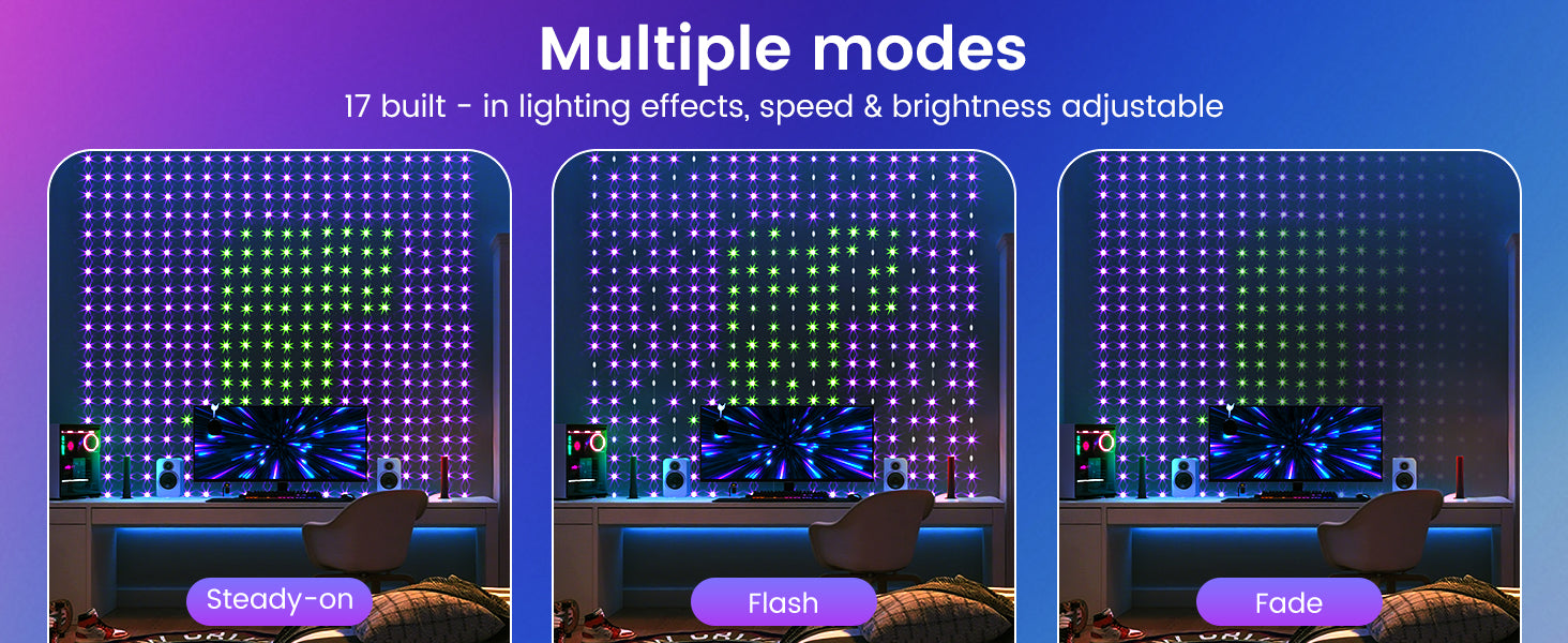 Quntis RGB Curtain Lights feature a variety of flashing modes, allowing you to create the perfect ambiance for any occasion. From steady light to dynamic flashing patterns, you can easily switch between modes to suit your mood, whether it's a relaxing evening or a lively party.