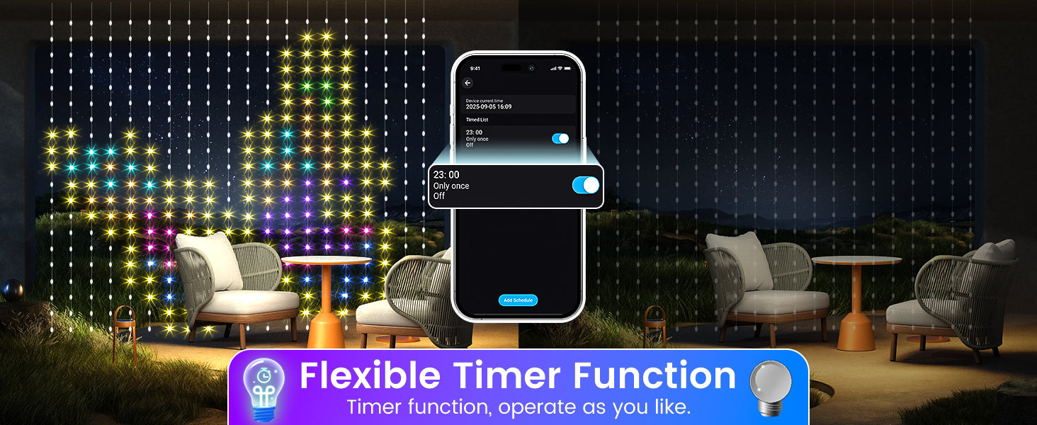 Quntis RGB Curtain Lights come with a built-in timer function, allowing you to set automatic on/off times. Perfect for saving energy or creating a hassle-free lighting schedule for your home or holiday decorations.