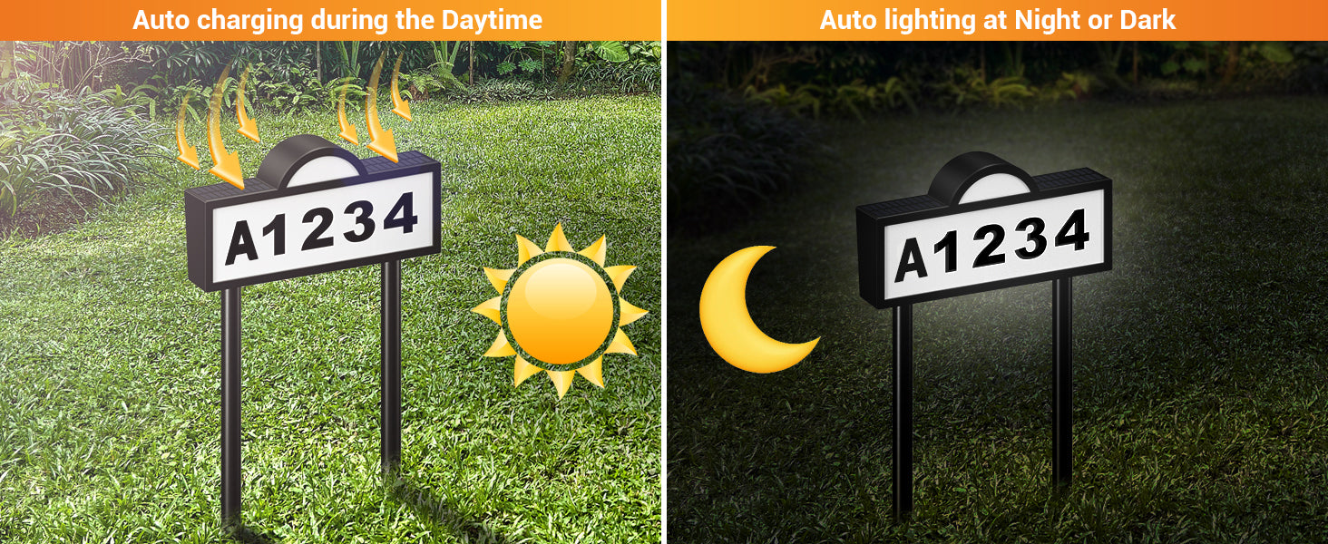 - 【Auto Switch & Super Bright LED】This solar-powered address sign is built in a photosensitive sensor, which will auto turn on at dusk and off at dawn, while its 45 super bright LED beads provide more than twice the brightness of another model, ensuring easy visibility of your address for family, friends, visitors, and delivery personnel, particularly during nighttime emergencies. This also helps first responders and firefighters locate your home more quickly and accurately.