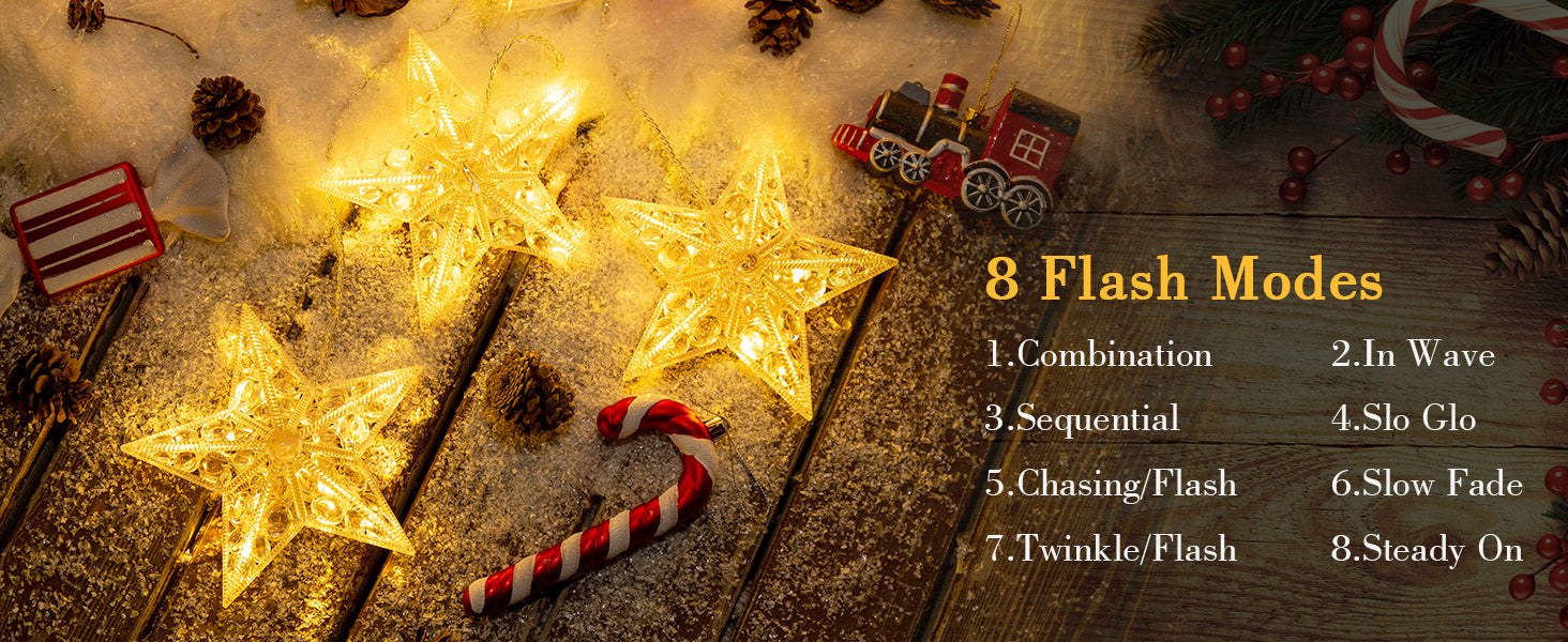 [8 РЕЖИМОВ ОСВЕЩЕНИЯ И ФУНКЦИЯ ТАЙМЕРА] Наслаждайтесь универсальностью этих рождественских огней в форме звезды, которые предлагают 8 впечатляющих режимов освещения: комбинация, волна, последовательный, медленное свечение, бегущие огни/вспышка, медленное затухание, мерцание/вспышка и постоянный свет. Легко управляйте режимами с помощью кнопки на проводном контроллере. С функцией таймера и памяти эти рождественские огни автоматически включаются каждый день, добавляя удобство вашим праздничным торжествам.