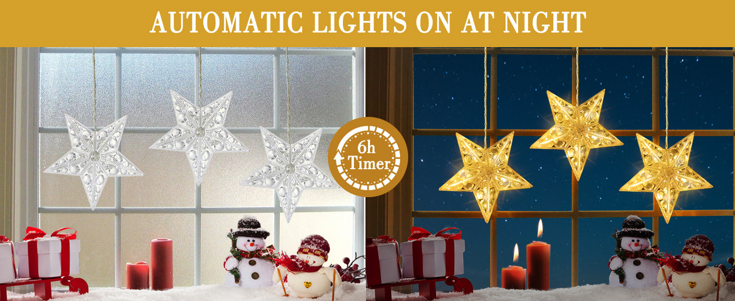 [РАБОТАЕТ НА БАТАРЕЙКАХ ДЛЯ УДОБСТВА И ДОЛГОВРЕМЕННОГО ИСПОЛЬЗОВАНИЯ] Эти звёздные висячие оконные огни работают от 3 батареек AA, что даёт вам свободу размещать их где угодно, не ограничиваясь шнуром питания или USB-штекером. Вы можете легко повесить эти рождественские огни на уличное дерево или разместить их на окне вашей спальни для уютного света во время сна. Как только батарейки вставлены, они обеспечивают более 90 часов непрерывного низковольтного освещения. Коробка с батарейками оснащена удобным переключателем для легкого включения/выключения.