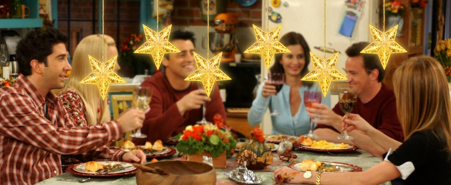 [ЛЕГКО УСТАНАВЛИВАЕТСЯ И ВИШАЕТ ВЕЗДЕ] Установка проста благодаря включенным 4 прозрачным клеевым крючкам, которые позволяют легко повесить рождественские огоньки в форме звезды на чистые, гладкие поверхности. Батарейный блок можно повесить отдельно, что обеспечивает его надежное крепление и скрытость. С водонепроницаемостью IP44 эти оконные звезды безопасны для использования на улице, даже в дождливые дни, что делает их идеальными для украшения любого пространства.