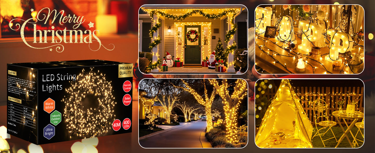 Quntis 40m 400-LEDs Solar Powered Waterproof Outdoor Christmas Fairy Lights – 8 Modes with Warm White Glow for Stunning Outdoor Decor