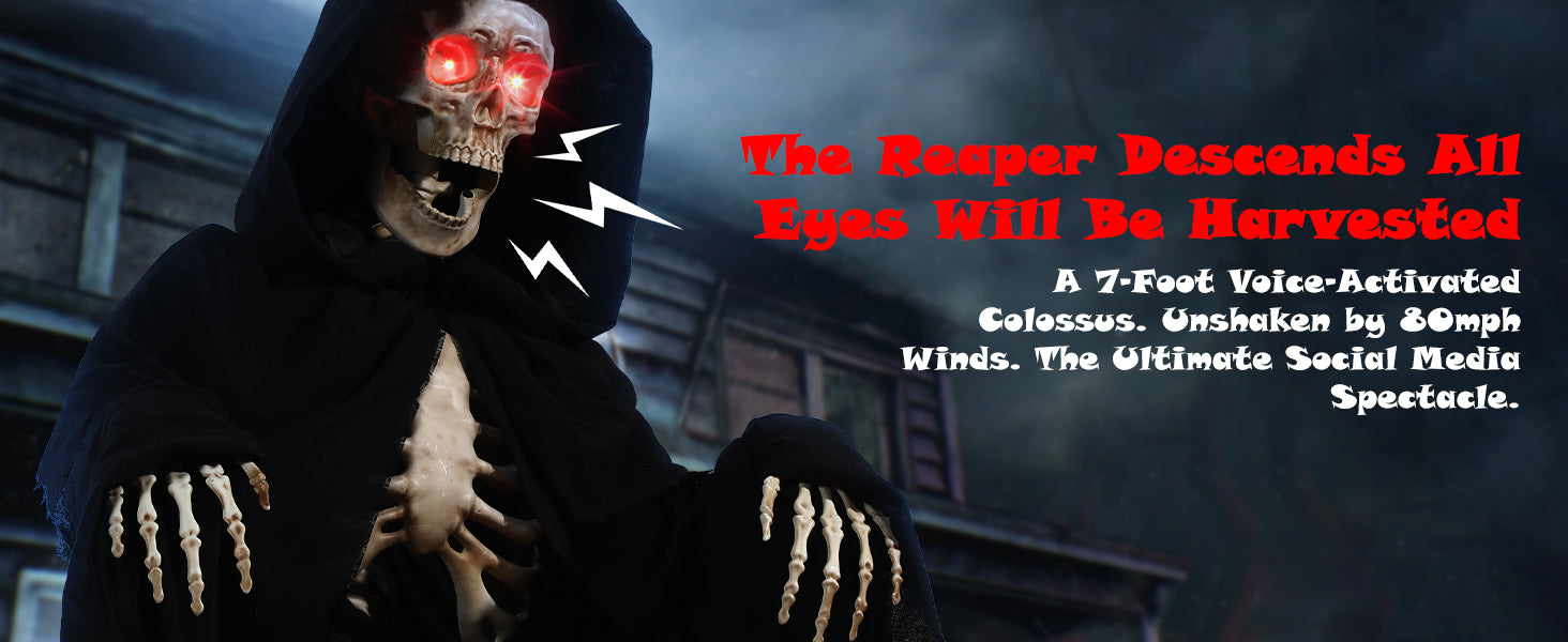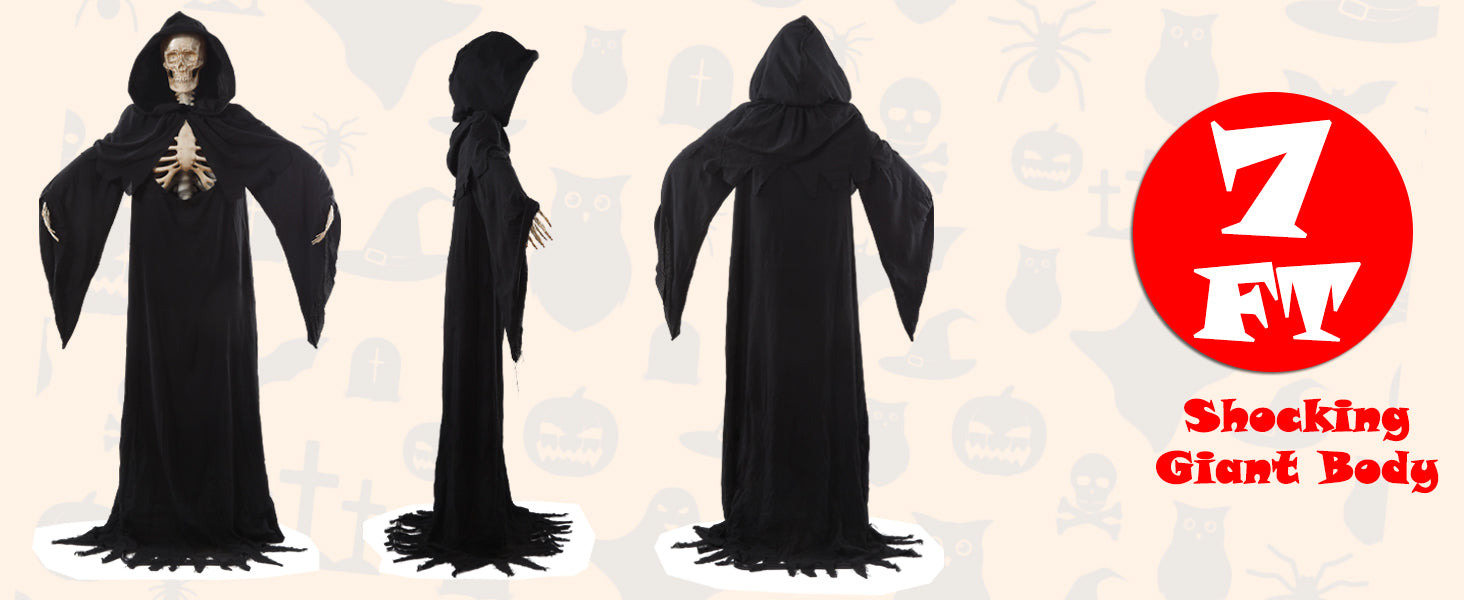 - 7FT Grim Reaper Halloween Animatronics - This towering 83-inch grim reaper perfectly embodies the spine-chilling essence of Halloween. Its tattered black robes flutter eerily in the wind, while the skull face appears even more sinister under the glow of its blood-red LED eyes. Whether day or night, those haunting crimson eyes become clearly visible from afar, as if the Grim Reaper himself has descended. You can adjust its arms to customize iconic horror poses and scare passersby.