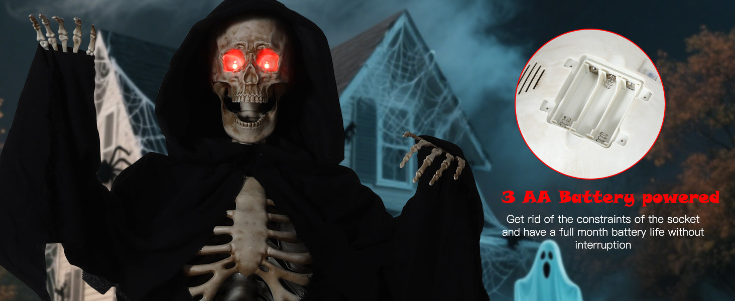 - Battery Power, Spread Fear Anywhere - This scary grim reaper outdoor decoration owered by just 3 AA batteries (not included), this battery-powered design lets you position your grim reaper animatronic anywhere indoors or outdoors—at a Halloween party, at a horror theme park, in a haunted house or in a cemetery setting! With long-lasting battery life, you can create professional haunted-house scares at minimal cost, ensuring jump-worthy moments for every trick-or-treater and guest.