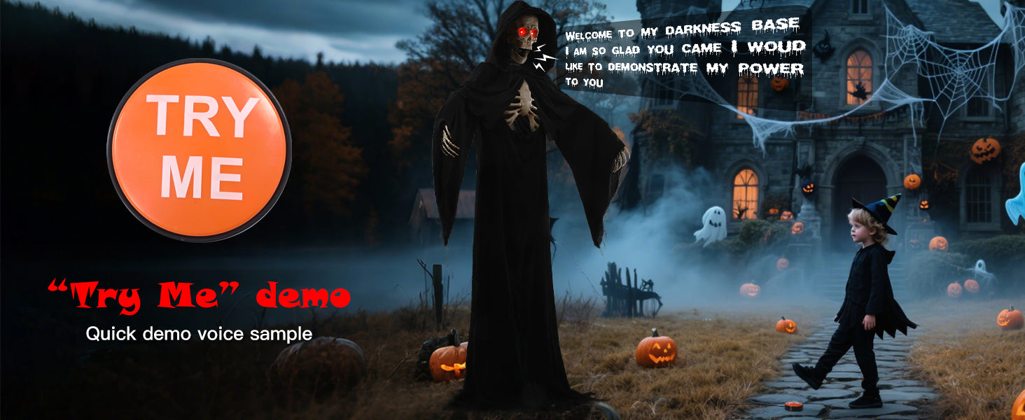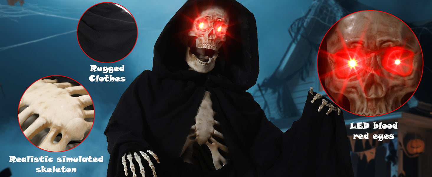- Sound & Touch Activated Sensors - The Ultimate Halloween Showstopper, a giant skeleton Halloween decor! When triggered by sound or touching, the grim reaper's eyes flash a menacing red, its jaw creaks open mechanically, and it delivers a bone-chilling curse in a raspy whisper: "WELCOME TO MY DARKNESS BASE.." Paired with realistic bone-rattling sounds and eerie audio effects, it creates an immersive horror experience, frightening trick or treaters, sending shivers down every passerby's spine.