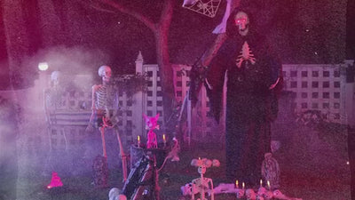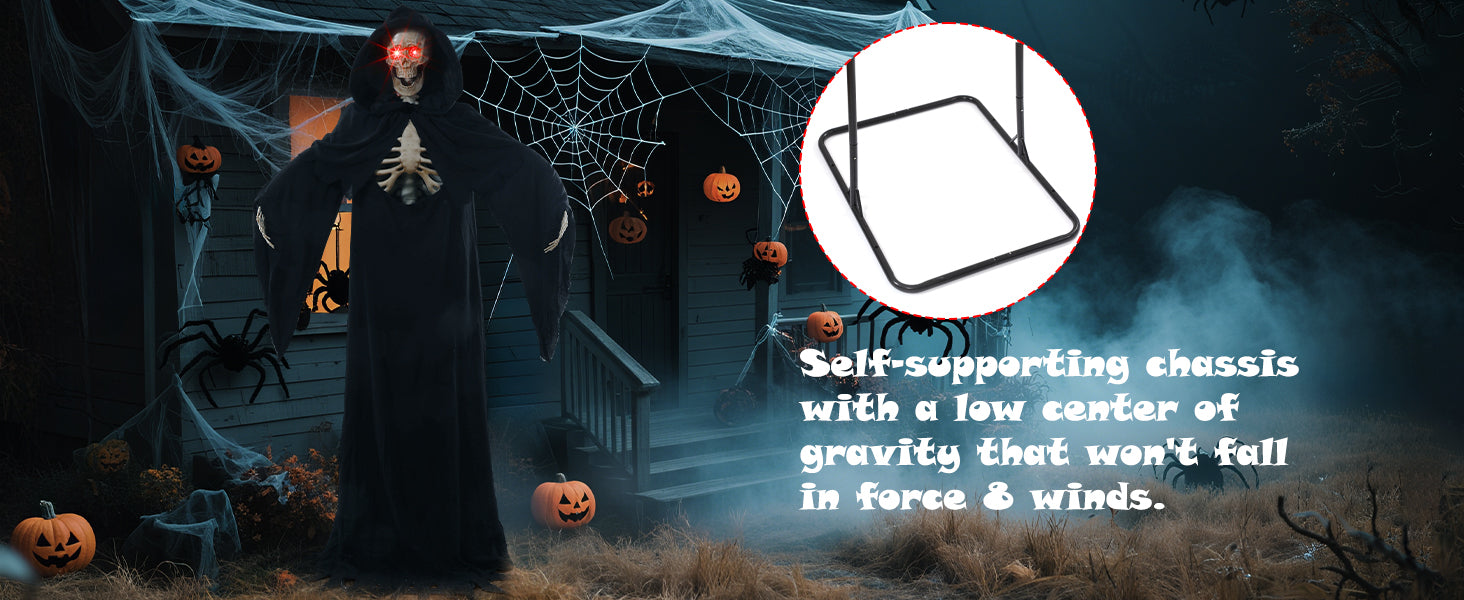 - Stable Skeleton Ghost Halloween Yard Decorations - This animatronic Halloween decorations built for indoor outdoor scares, its 12.3-lb weighted base and low-center-of-gravity structure ensure it stands unshaken even in 8-level winds—no more embarrassing "fallen reaper" mishaps! Whether placed the skeleton Halloween decor on the garden, lawn, porch, or deep in the woods, it remains as immovable as a real gravestone, guaranteeing your Halloween terror never falters.